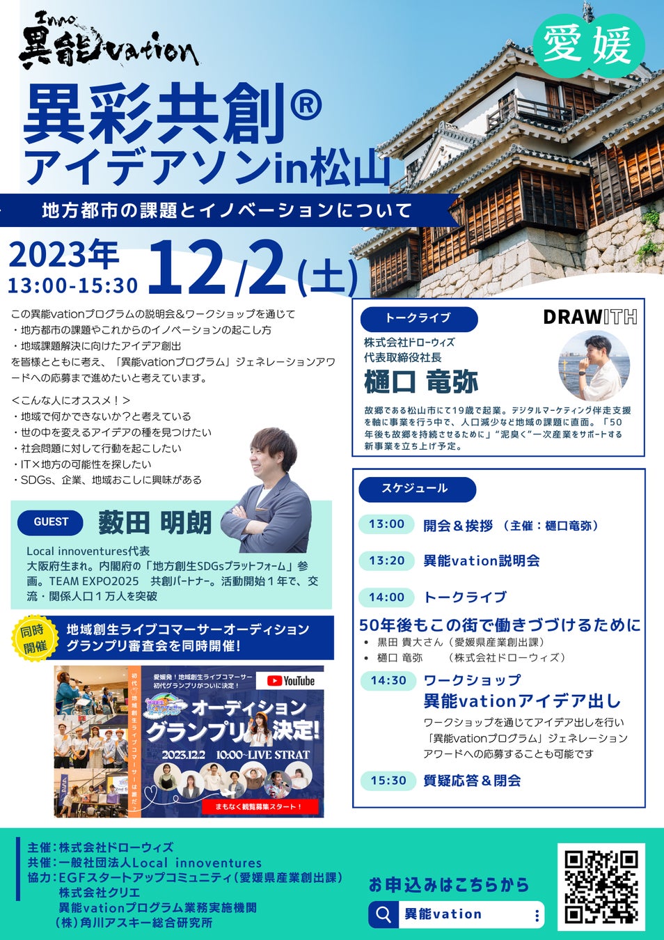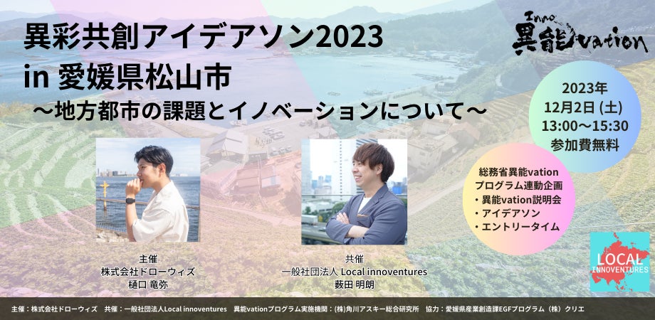 株式会社ドローウィズ(代表:樋口竜弥、本社所在地:愛媛県松山市)は一般社団法人Local innoventures(代表理事:薮田明朗)と連携し、総務省異能vationプログラム連動企画「異彩共創®︎アイデアソン2023in愛媛県松山市 〜地方都市課題とイノベーションについて〜(以下、「アイデアソン」)」を2023年12月2日(土)に開催いたします。