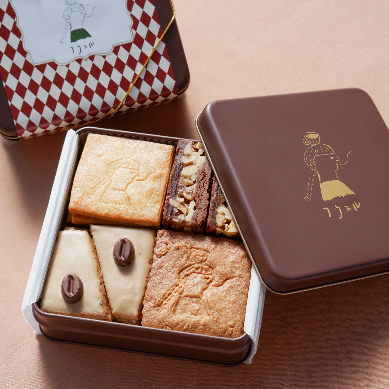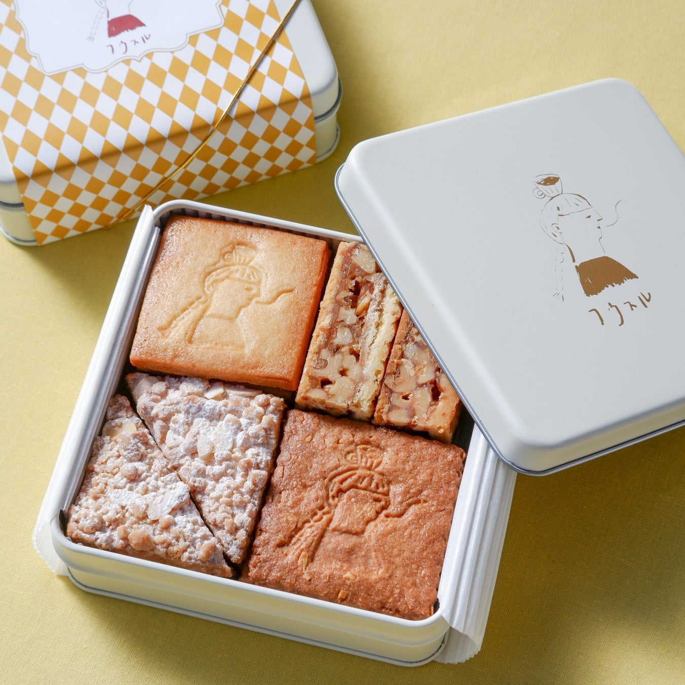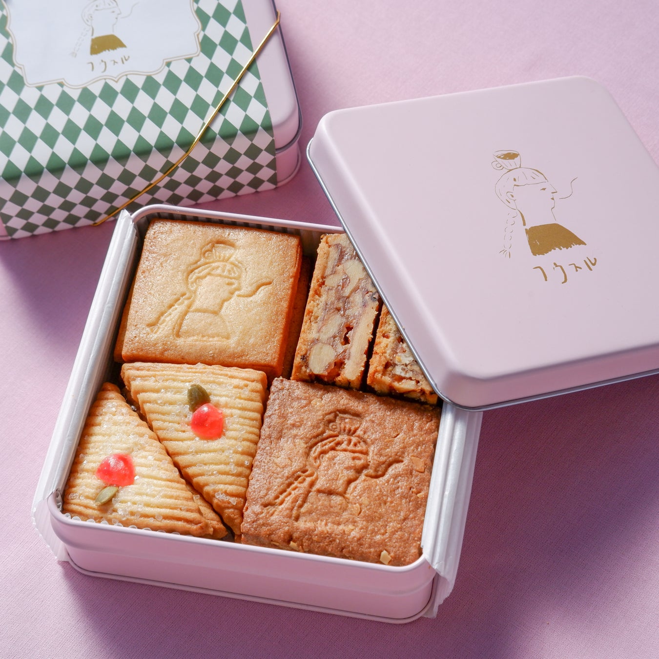 缶をお皿に見立て、蓋を開けたらすぐにティータイムが始められるようにという思いを込めて名付けました。オリジナルのロゴが押された人気の定番クッキー2種と、缶の色に合わせたフレーバーの焼き菓子が入っています。