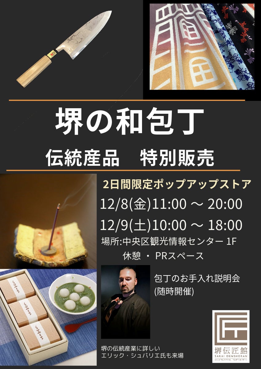 堺伝匠館(※1)は東京都中央区京橋駅の「京橋エドグラン」内1階にある「1階休憩・PRコーナー」を使用して、堺刃物をはじめ堺の伝統産業をPR・販売する「堺の和包丁 伝統産品 特別販売」を、2023年12月8日(金)~9日(土)の2日間にて開催します。