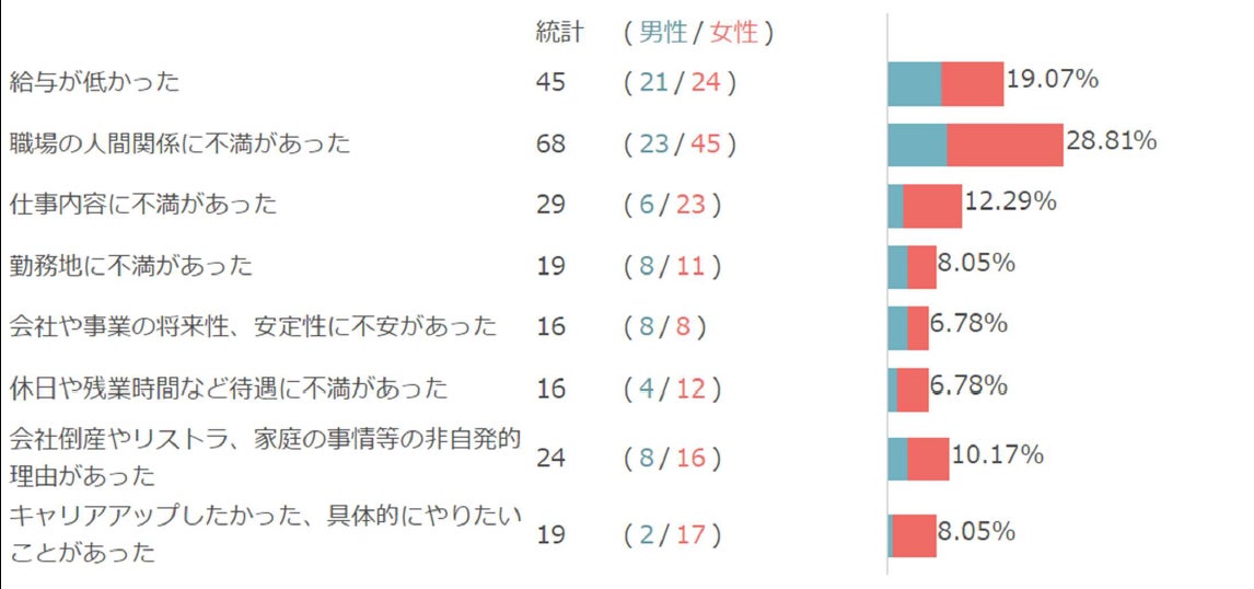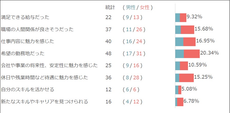転職を考えたきっかけは「職場の人間関係に不満があった」が第1位。一方、転職先への入社の決め手は人間関係や給与の順位が下がり、「希望の勤務地だった」が第1位という結果に。