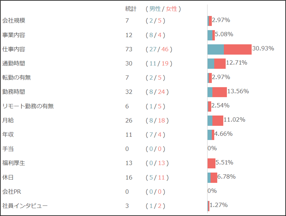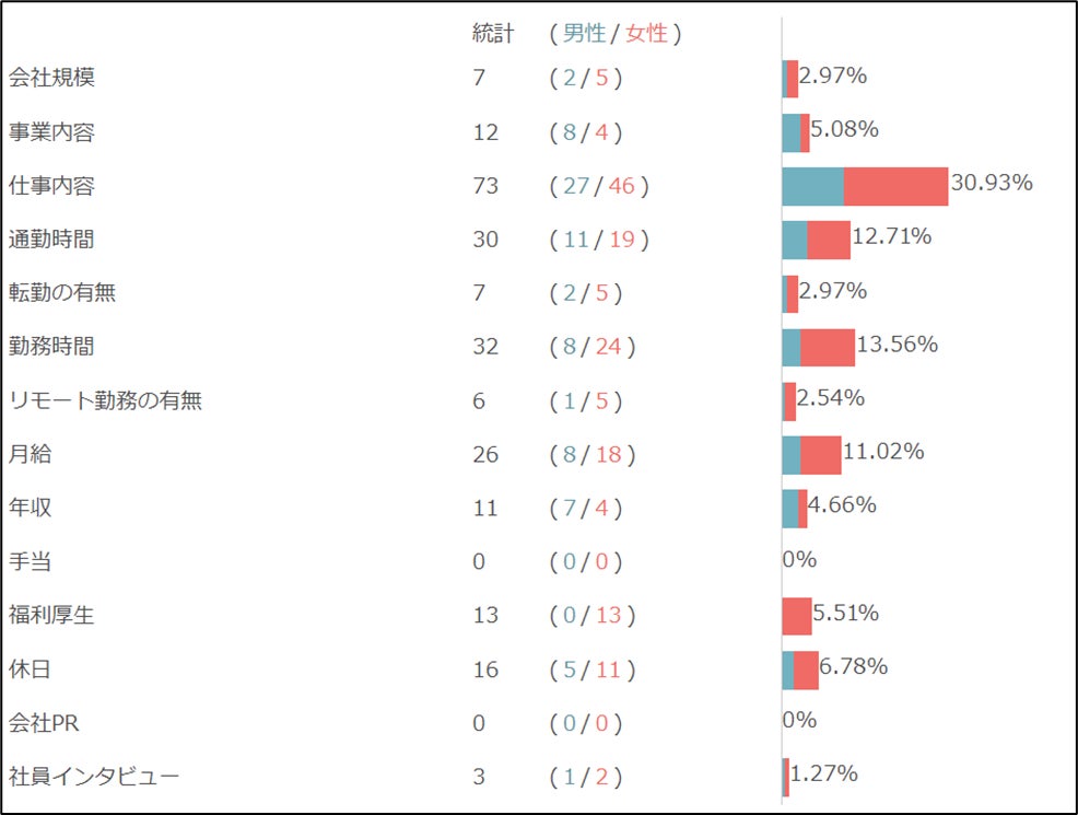 求人票・求人広告で応募先決定への影響度が最も大きいのは「仕事内容」。次いで、「勤務時間」「通勤時間」と続いた。給与関連では「年収」よりも「月給」の影響度が大きい結果に。
