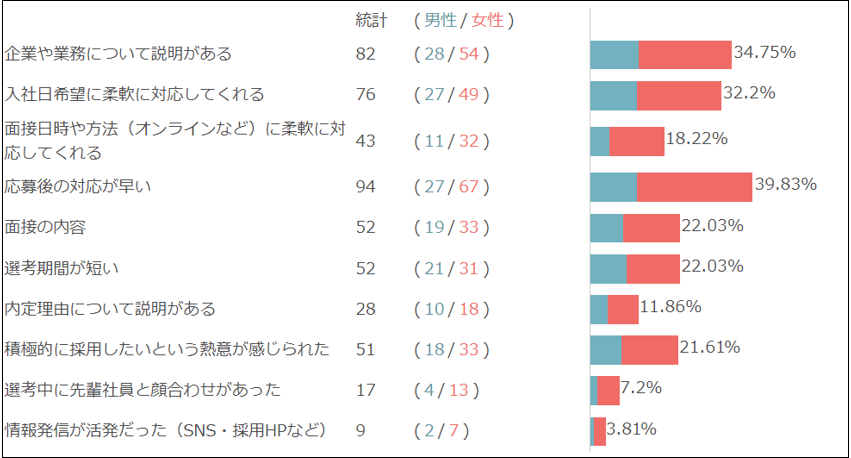 選考における対応スピードが入社意思決定に大きな影響を及ぼすことが分かった。転職活動中という精神的に不安定になりやすい環境下で、対応の丁寧さ、柔軟性がある企業に対してはポジティブな影響が見られた。