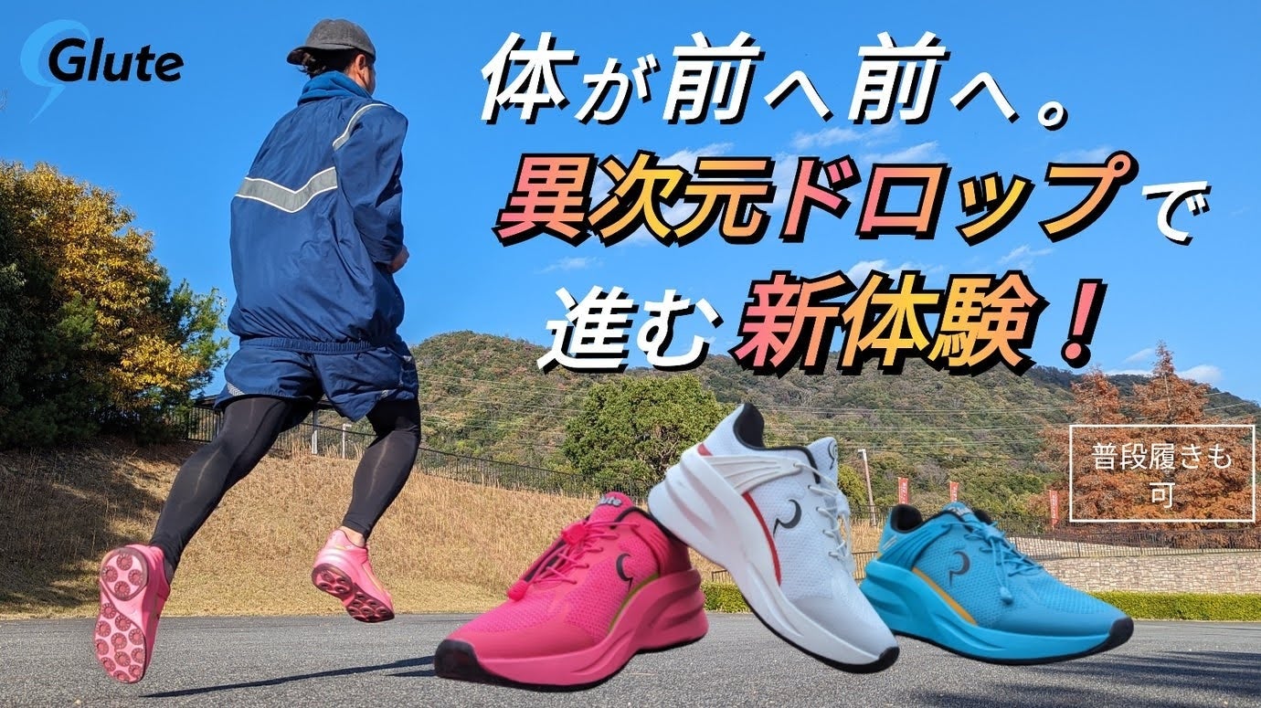 今回、Makuakeにて応援購入を募集するのは、ドロップ(つま先とかかとの厚みの差)を高く設けたランニングシューズ「GLUTE MAX-RUNNING」。