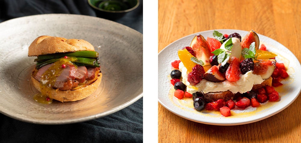 (左)オリーブバゲットのスモーブロー (右)フルーツとベリーのデザート