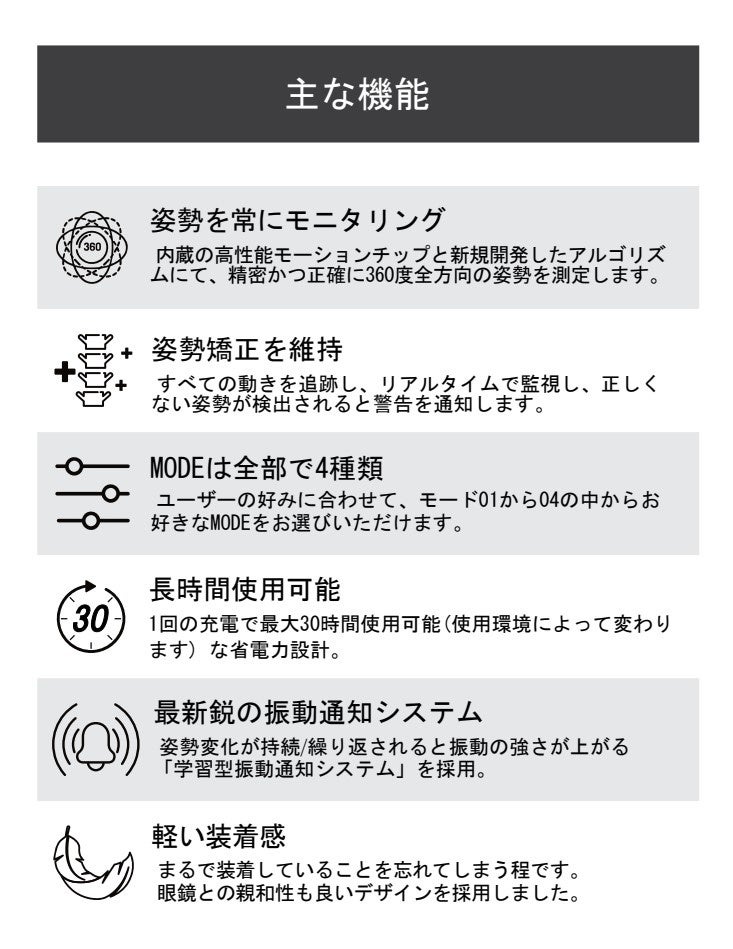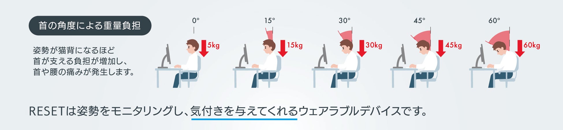また、RESETは装着時に一人一人の姿勢を自動計測しますので、角度が合わず使えない等と言った心配もありません。