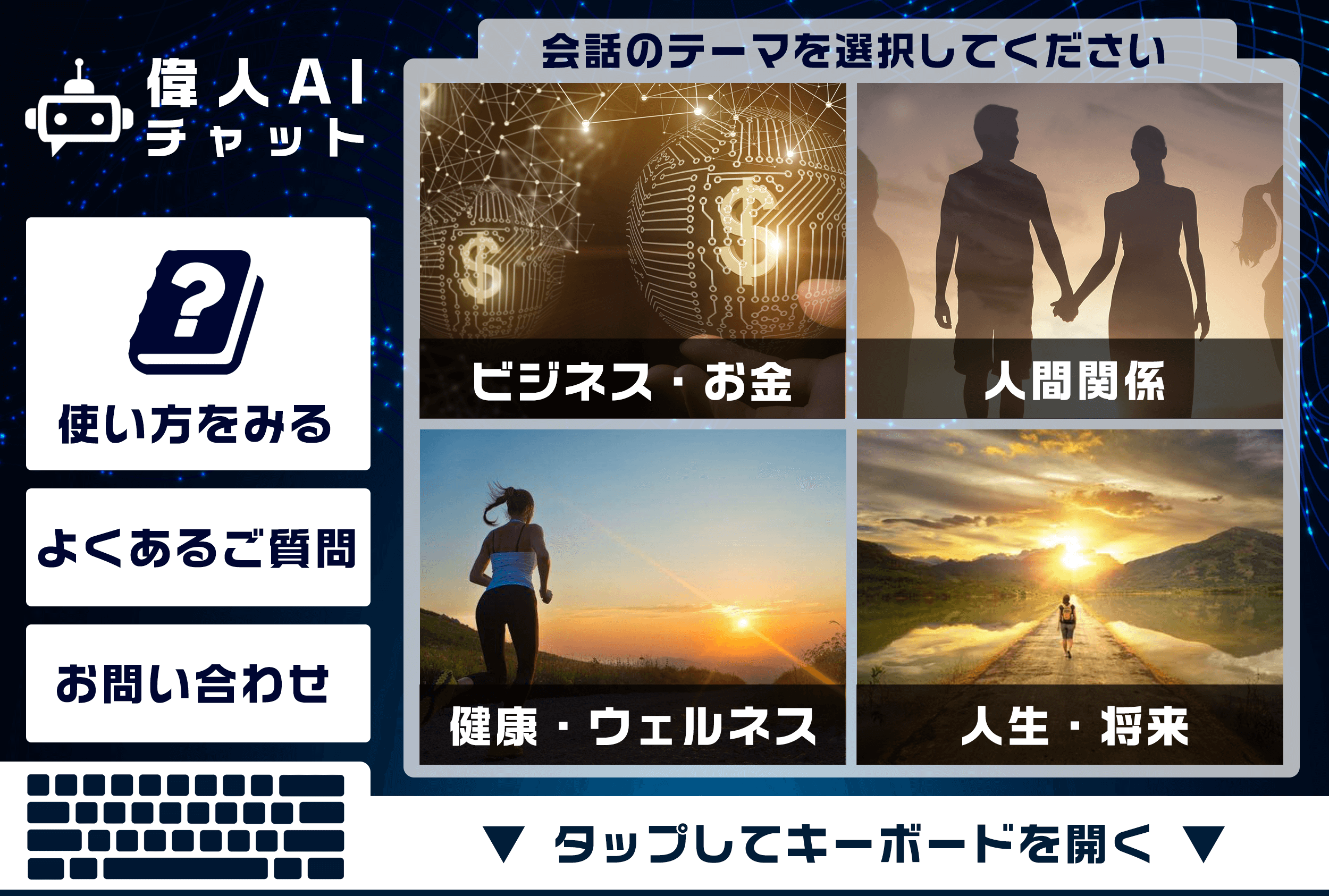 選択できる会話テーマは「ビジネス・お金」「人間関係」「健康・ウェルネス」「人生・将来」の4種類あり、それぞれのカテゴリに応じた偉人との対話が可能です。