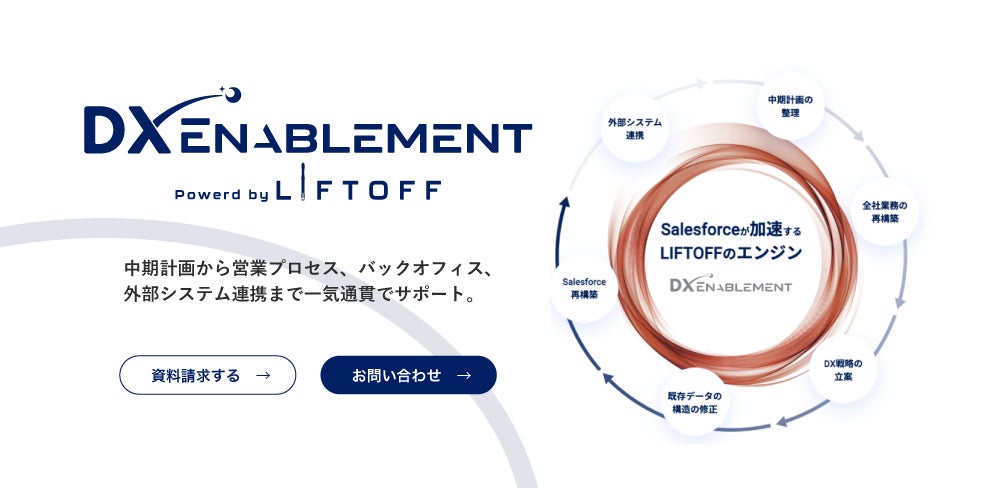 DX コンサルティングファームの株式会社リフトオフ(本社:東京都港区、代表取締役:五十畑光二)は、中小規模の企業の IT を全面的に支援するサービス「DX Enablement」のサイトをオープンしました。β版のサービスとして約1年間、各社の課題を具体化し、実際に課題の解決を実現してきたことで、本サービスの正式リリースと同時に、サービスサイトをオープンしたことをお知らせします。本サイトでは、中小企業が感じる「営業組織」の課題を具体的に表現し、Salesforce を中心に、当社がどのように課題解決に取り組むかについて説明しています。