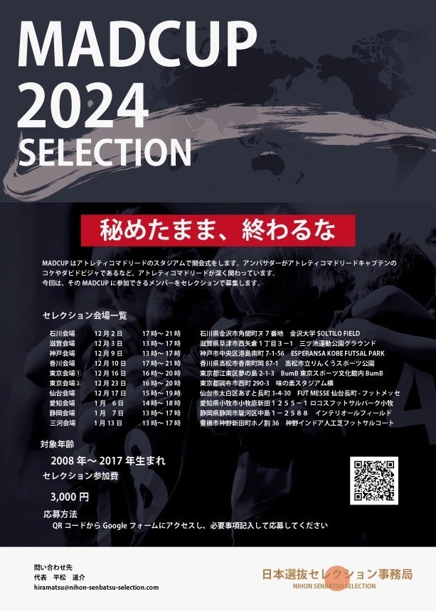 その日本代表チームのセレクションを毎年11月から全国で開催しております。