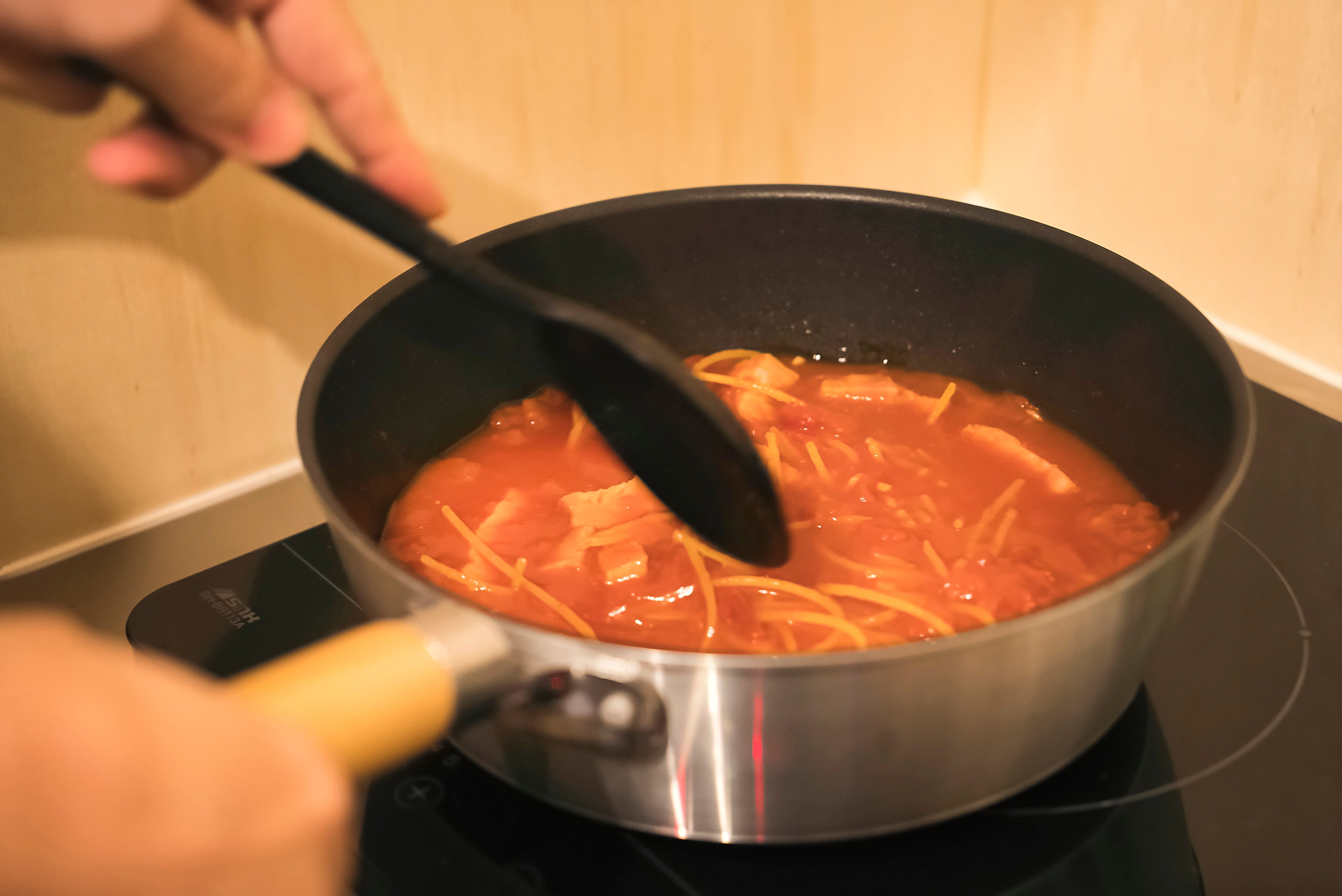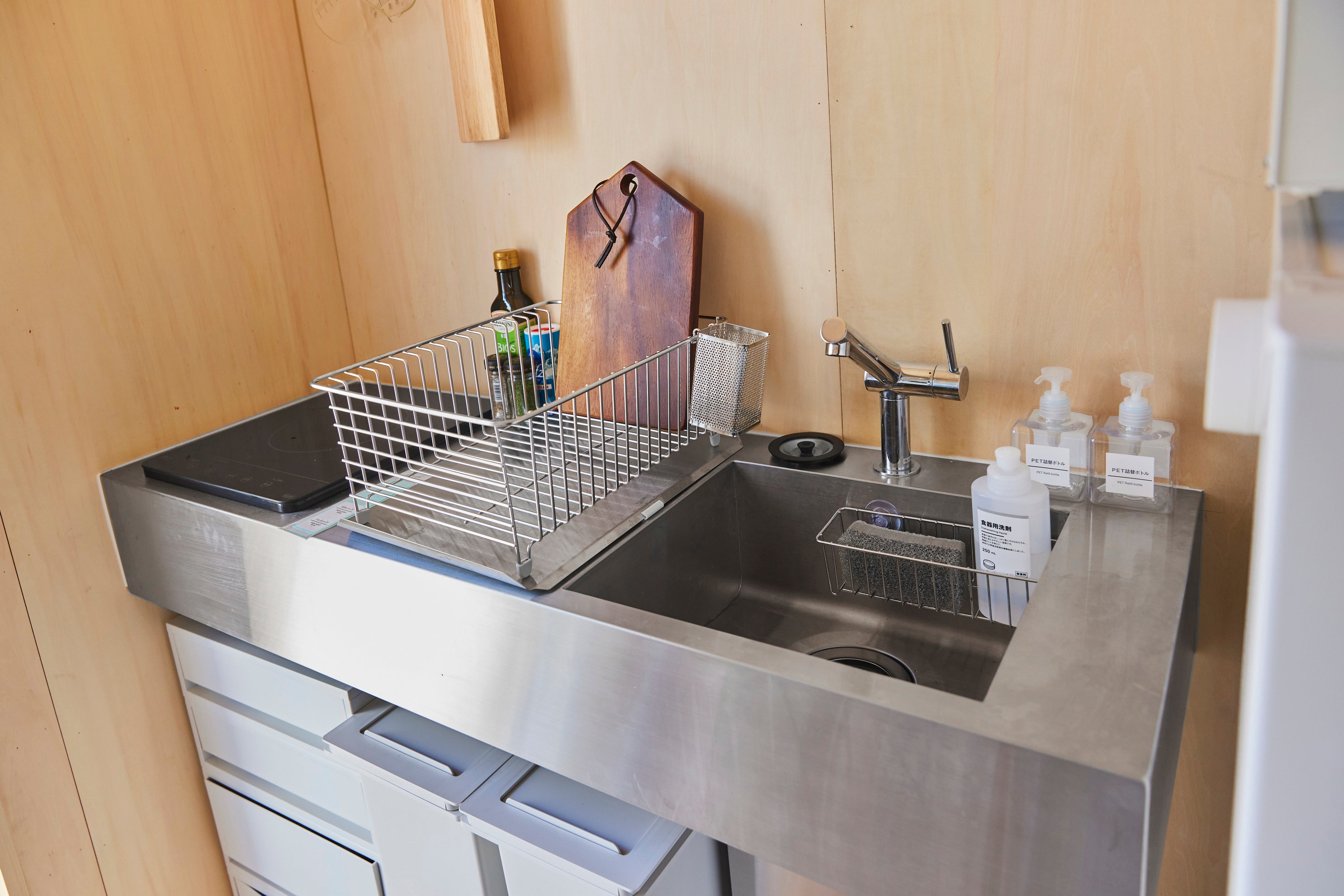 太陽光パネルで発電した電力を使用し、IHクッキングヒーターの他、電子レンジやケトルも使えます。またシンクを備え付けており、水循環システムで浄化した水を使用することができます。排水した水は再び水循環システムで浄化され、再利用することができます。