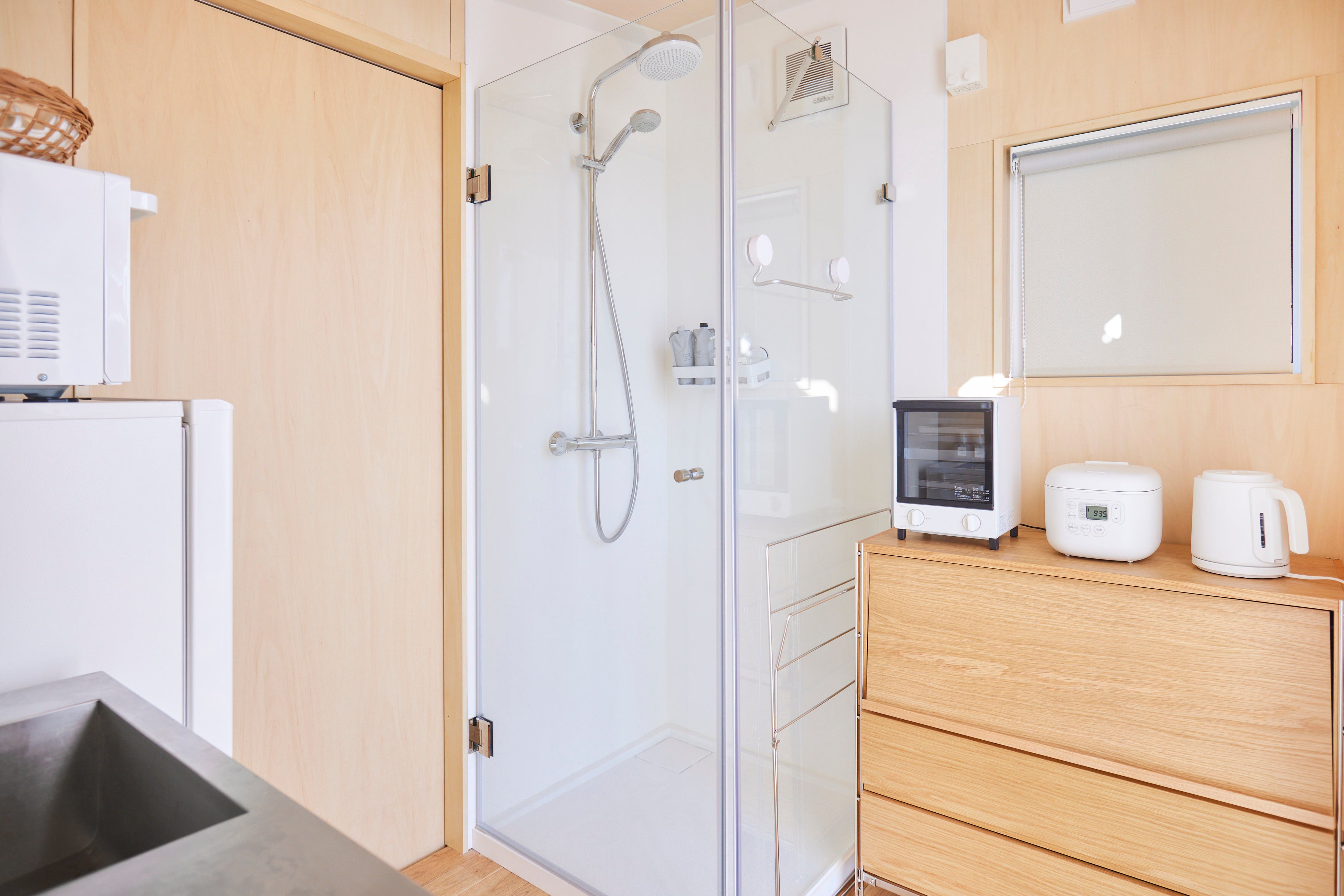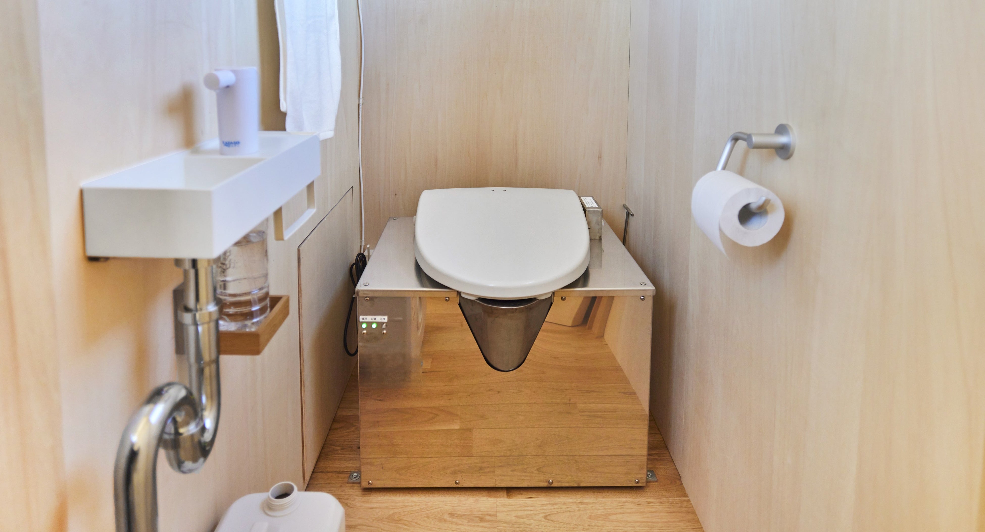 水を使わず、微生物によって処理するバイオトイレを採用。電気制御により分解性能と消臭性を高め、排泄物や生ごみ、トイレットペーパーも分解可能です。1日に約20回程度使用することができ、2人暮らしでは問題なく生活することができます。