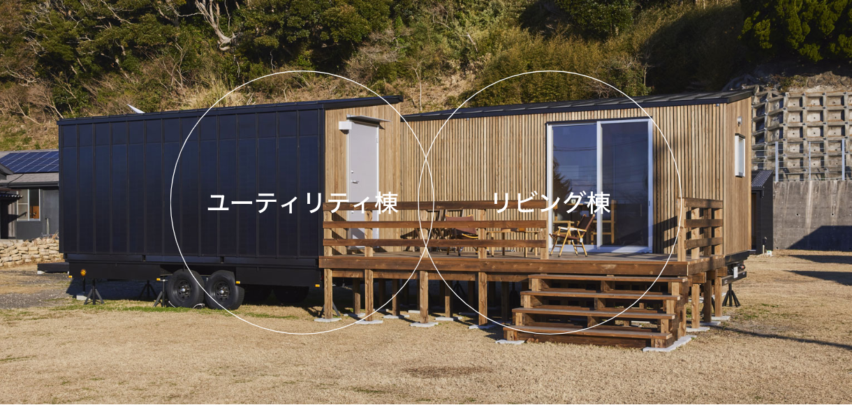 「ユーティリティ棟」と「リビング棟」2つのユニットを組み合わせた、車で運べるモバイルハウスです。