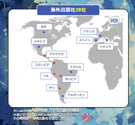 CoachingPopは、グアテマラ、コロンビア、ペルー、ボリビア、チリなどの国々で初のマンガ出版社設立において重要な役割を果たしてきました。革新的な「自分の出版社を作る」プログラムを通じて、どの国でも出版社を設立するための包括的なコーチングサービスを提供しています。このサービスは出版社設立の指導だけでなく、日本の出版社との連携やライセンス取得のアドバイスも含み、新しい市場でのマンガの専門的かつ効率的な拡張を促進しています。さらに、今月、CoachingPopは日本語のウェブサイトとソーシャルメディアを立ち上げ、日本の著者や出版社との結びつきを強化し、グローバルなプレゼンスを増加させます。