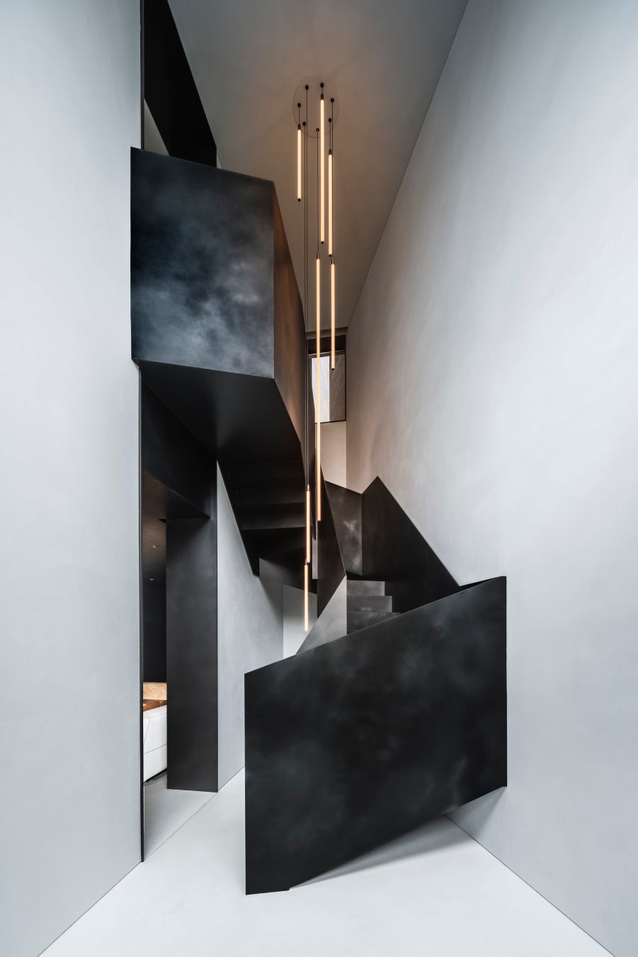 邸宅全体を通じて、光、眺望、空間への配慮がなされています。空間を進むにつれて屋上テラスへと導かれる動線の中で、素材の色調が暗から明へと変化し、光へと向かう旅路を象徴的に表現しています。N°001 Minami Aoyamaの最上部には、エンターテインメント空間としてのキッチン設備、遠くまで見渡せる夕景、そして緑化された屋上の一部を備えた壮大なテラスが広がり、東京タワーもこの屋上から眺めることができます。邸内の移動体験をより豊かにしているのが、折り紙のような造形を持つ、インパクト溢れる螺旋状の階段です。折り曲げられたスチール材から成るこの階段は、地下から地上階までを結び、室内庭園に隣接し、特注のペンダント型シャンデリアによって照らされています。