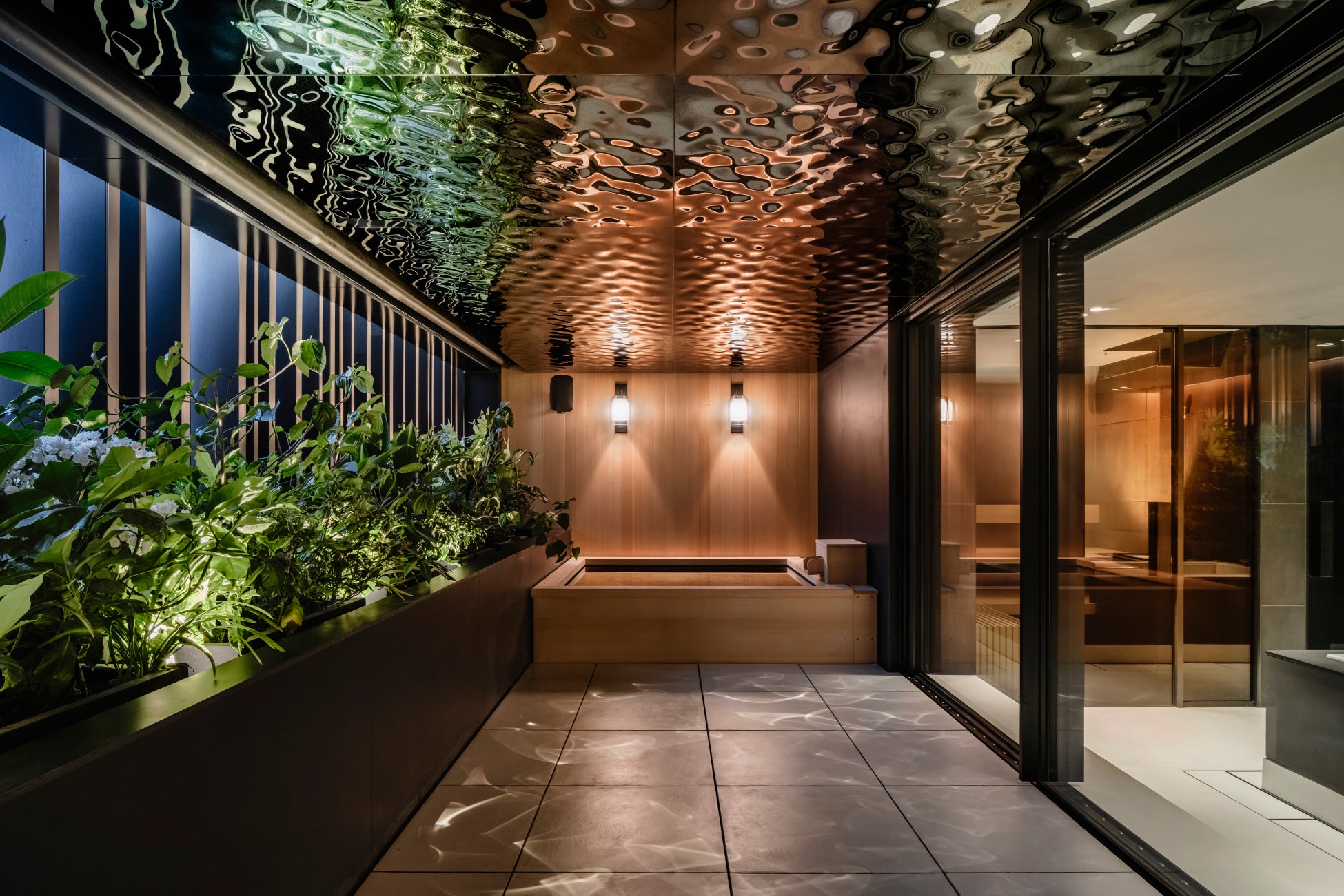外観は縦ルーバーで構成され、時間帯によって光の反射が変化し、建物に動きとプライバシーをもたらします。2階のスパテラスには波打つ鏡天井と植栽が施され、内と外が緩やかに溶け合う設計です。