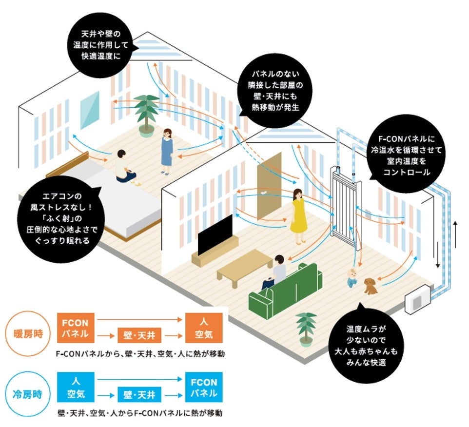 ■F-CONパネルに冷温水を循環させることで室内温度をコントロール。温度ムラが少なく大人も子供も快適。