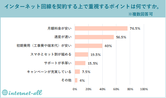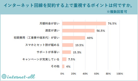 76.5%の人がインターネット回線を契約する際に『月額料金の安さ』を重視すると回答し、次いで56.5%の人が『速度の速さ』を重視すると回答しています。