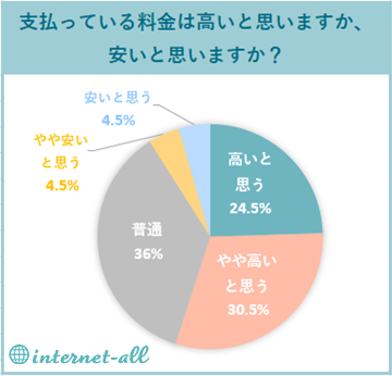 インターネット回線に支払っている料金について、55%の人が『やや高い』『高い』と感じており、反対に『やや安い』『安い』と感じている人はわずか9%という結果でした。