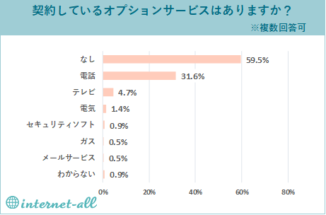 オプションサービスを契約している人は全体の39.6%で、電話やテレビなどをインターネットとセットで契約している人が多かったです。また、約6割の人はオプションサービスを契約していないと回答しています。