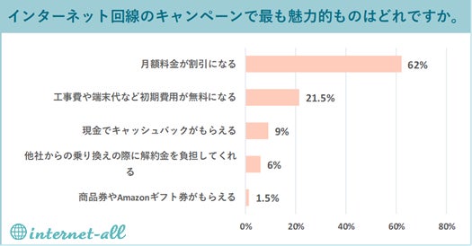 インターネット回線のキャンペーンでは、『月額料金の割引』に魅力を感じる人が一番多く、全体の62%を占めています。