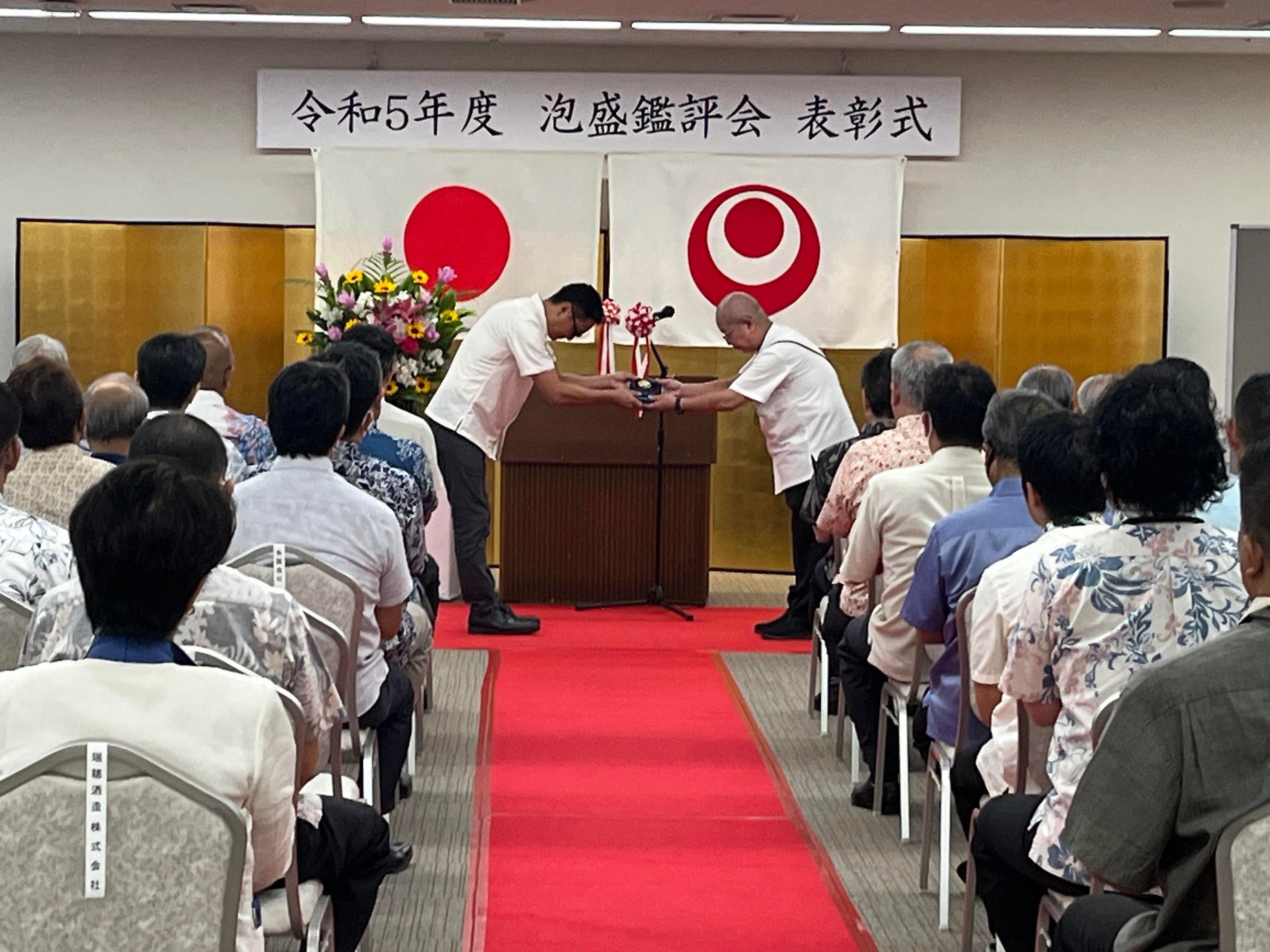 沖縄県の伝統的銘酒「泡盛」について、「品質評価及び理化学分析を通じて酒造技術基盤強化・製造技術の発展を促し、併せて沖縄県の重要な地場産業である泡盛製造業の発展に資すること」を目的とした鑑評会「令和五年度泡盛鑑評会」。沖縄が本土復帰した1972年から始まり、今年で51回目の開催となります。出品された泡盛は官能評価(きき酒)によって審査され、その品質が優秀と認められた泡盛について、製造場(酒蔵・メーカー)を表彰します。今回、神村酒造は「暖流3年古酒」で「沖縄県知事賞」を受賞。 さらに、沖縄国税事務所長から授与される「泡盛ブレンダー・オブ・ザ・イヤー」を渡久地洋平工場長が受賞しました。こちらは、出品酒のうち、ブレンドにより製造された泡盛の中で最も品質が優秀だと認められた泡盛に対して、そのブレンド担当者(ブレンダー)を表彰するものです。
