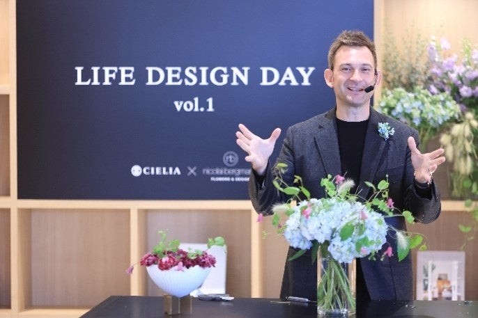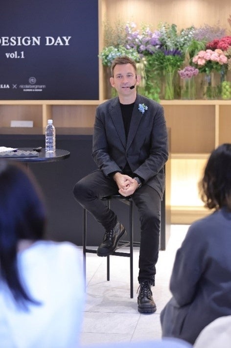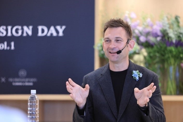 MCよりイベント開催のご挨拶ののち、ご登壇いただいたのはフラワーアーティストのニコライ・バーグマン氏。ニコライ氏は、東京を拠点に世界的に活躍されているフラワーアーティストで、日本でトレンドを生み出した「フラワーボックス」をはじめ、住まいや商業空間、ギフトシーンやパーティーシーンなど、様々なシーンでその作品が愛されています。