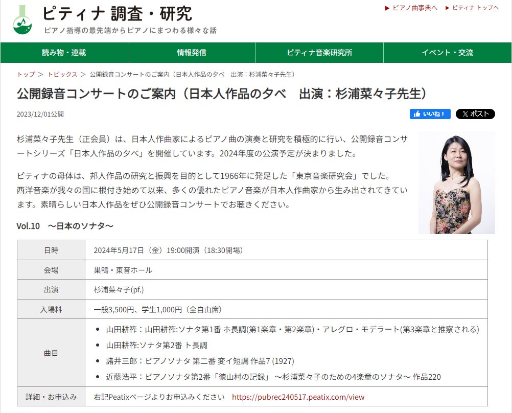 ・ピティナ主催「日本人作品の夕べ」公開録音コンサート詳細URL