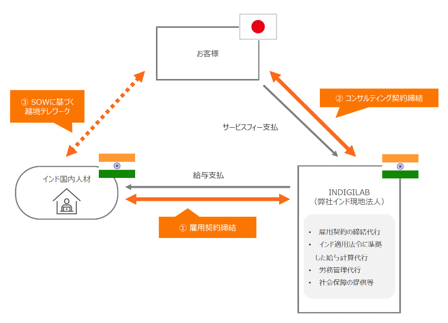 EORは、Employer Of Record(記録上の雇用主)の略称で、企業の海外雇用を代行するサービスです。海外で従業員を雇用する際に、現地法人を設立することなく、弊社関連会社株式会社INDIGITALのインド現地法人であるINDIGILAB Private Limited(以下INDIGILAB)が代替雇用を行い、インド人材がインド国内で安心・安全に働けるように環境を整えます。企業は、弊社と業務委託契約を締結し、給与計算や労務コンプライアンス・税務対応などは弊社側が、業務上の指示・レビューや人事評価は企業側が行います。