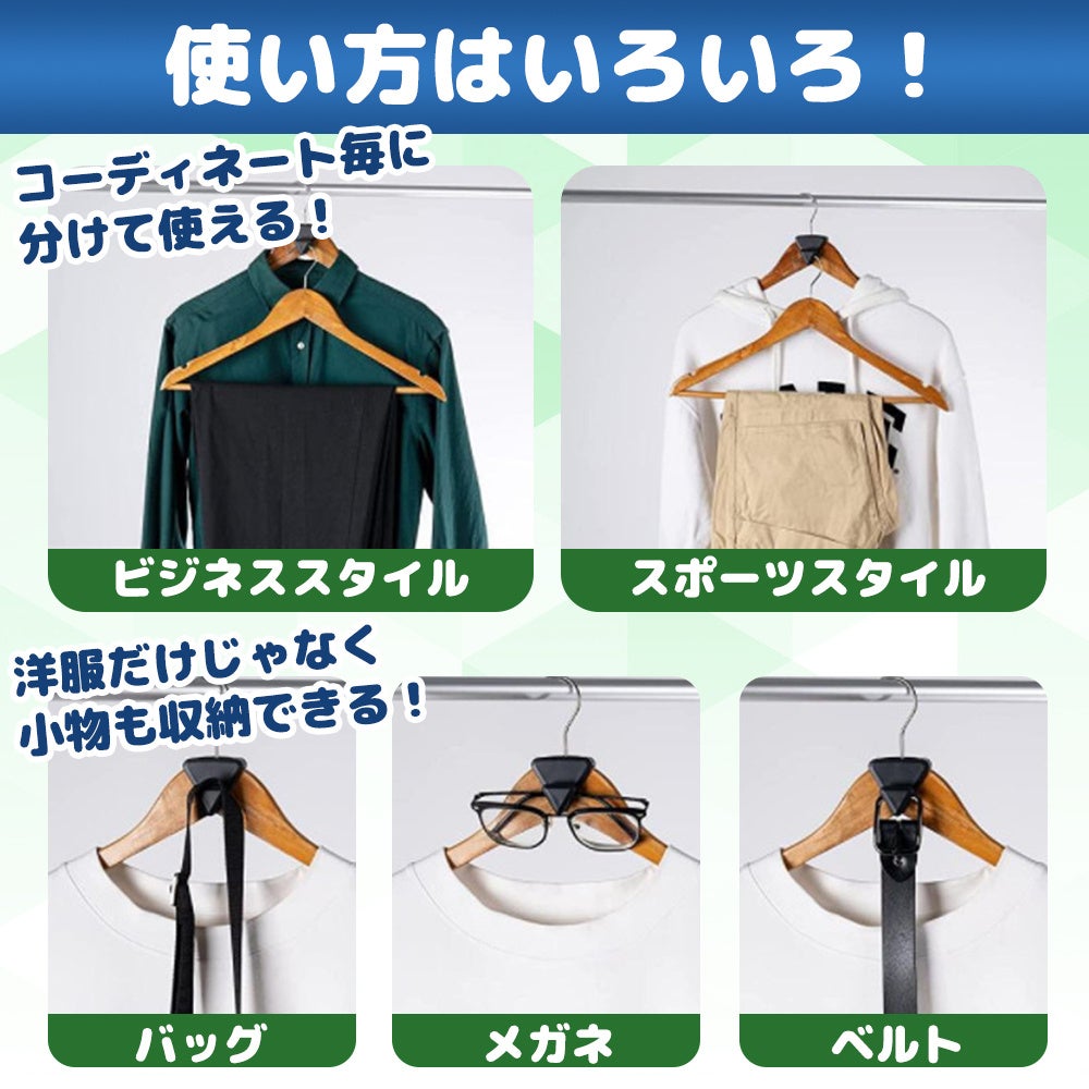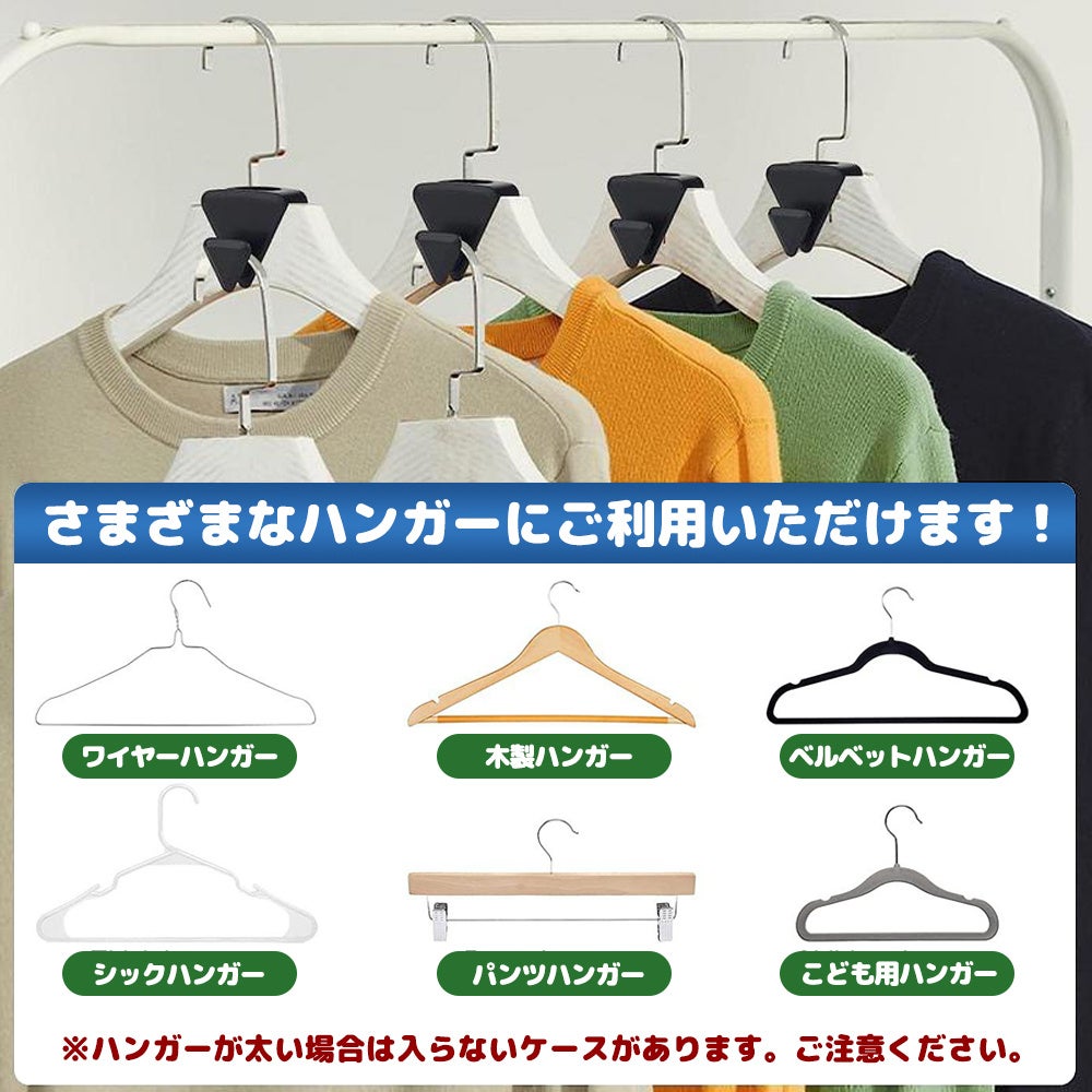 ハンガーに別のハンガーを引っかけるだけで、スペースを有効活用することができます。パンパンに詰まったキャビネットをすっきりできる便利なアイテムです。