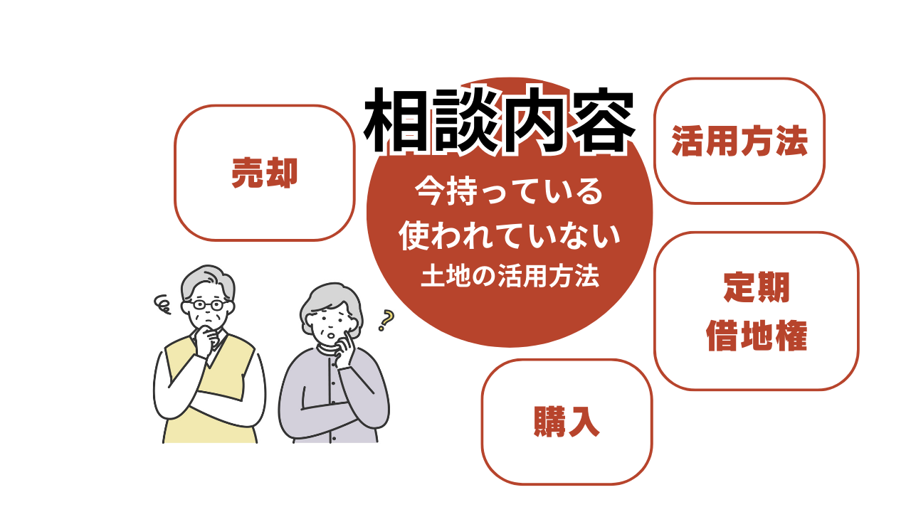 現在お持ちの土地について悩んでいることをお聞かせください。また、土地の購入について悩んでいる方もご相談に乗らせていただきます。現在土地の活用をしているがなかなかうまく収益化できていない方などもご相談ください。