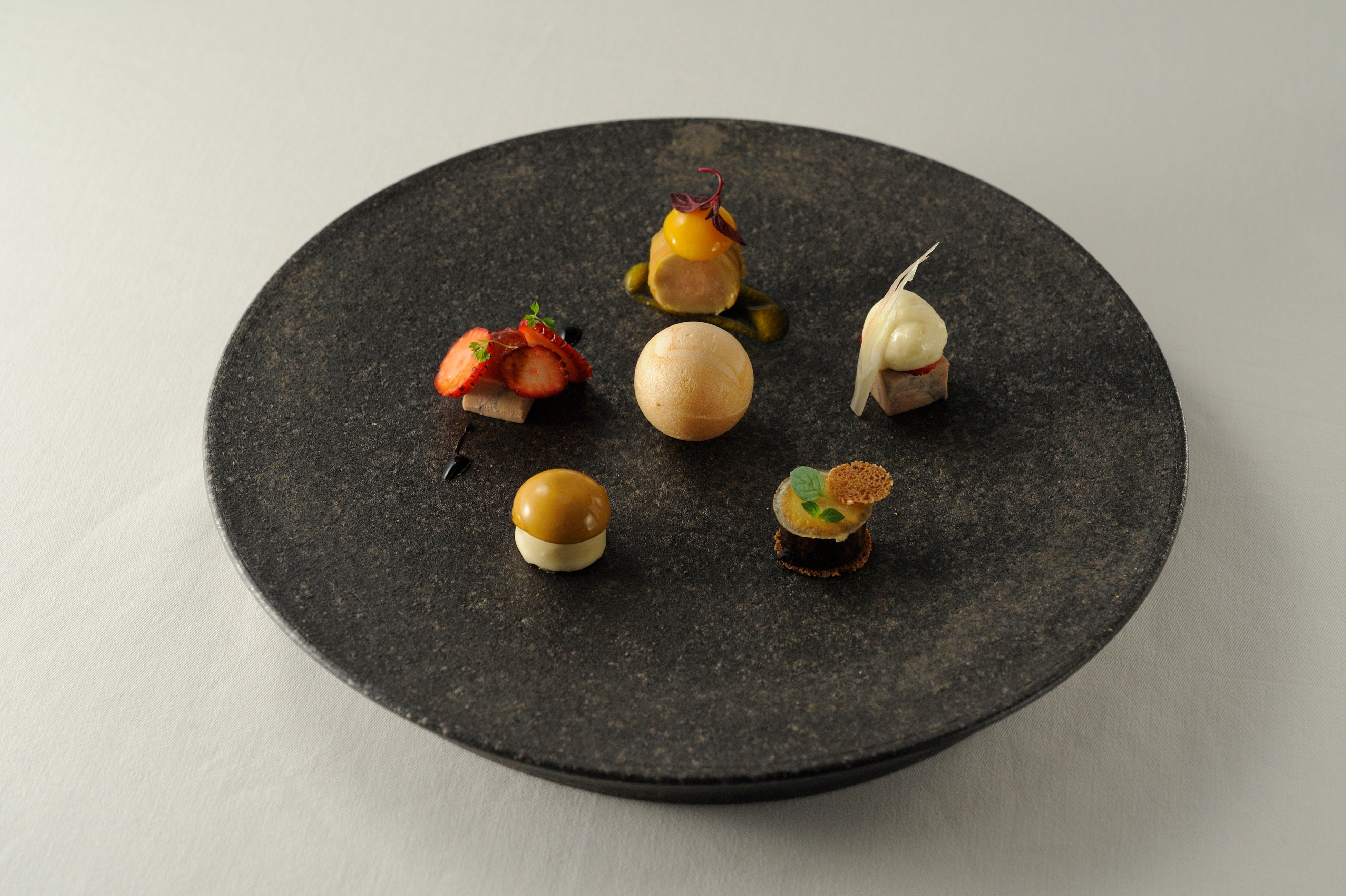 日本各地の風土で育まれた力強い食材を中心とし、“四季折々を彩る和”、”組み合わせの調和“、”味わいの和み”を根幹としてビジュアル、五味、五感、食材の時間軸(フレッシュ、加熱、発酵、熟成)を意識し、目の前で繰り出される瞬間的な美味しさと奥行を感じる緻密な料理、”凝縮と旨味”をテーマに伝統と現代を感じるイノベーティブフレンチをお楽しみいただきます。