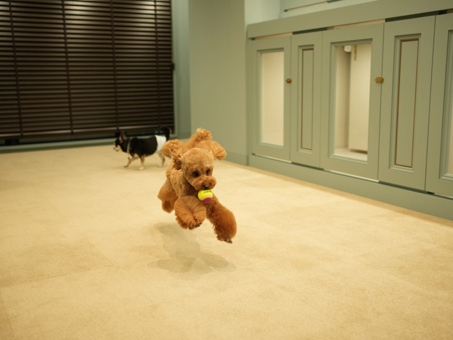 ペットホテルは広々としたお部屋と走って遊べるフリースペースを設けております。フリースペースではスタッフが見守るなか、他のお友達たちと遊ぶこともできます。リラックスできる空間と楽しい空間で愛犬のストレス負担を減らします。