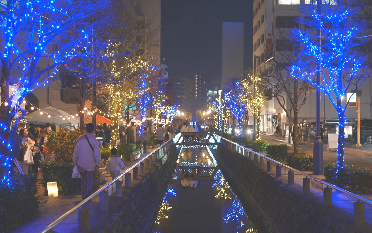 シャンパンゴールドとオーシャンブルーの光が川面を彩り、冬の星川に新たな魅力を創出