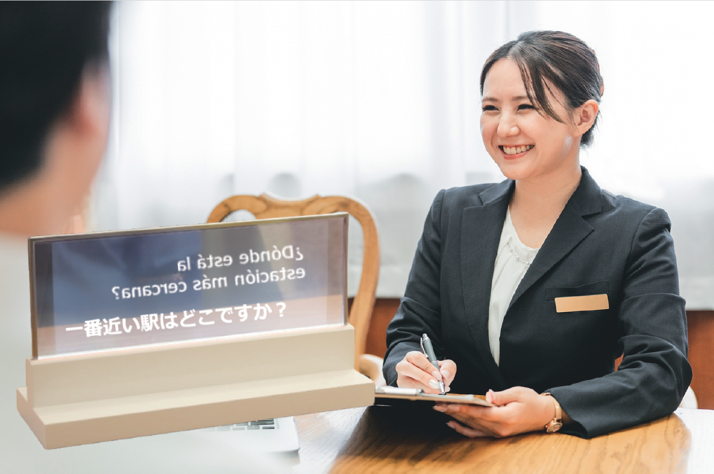 ディスプレイ越しにお互い顔を見ながらコミュニケーションを取ることができるため、チケット購入窓口やホテル窓口等、自治体での手続き対応などにおいて、言語の違いによるコミュニケーションの不自由さを感じることなくスムーズにやりとりできます。
