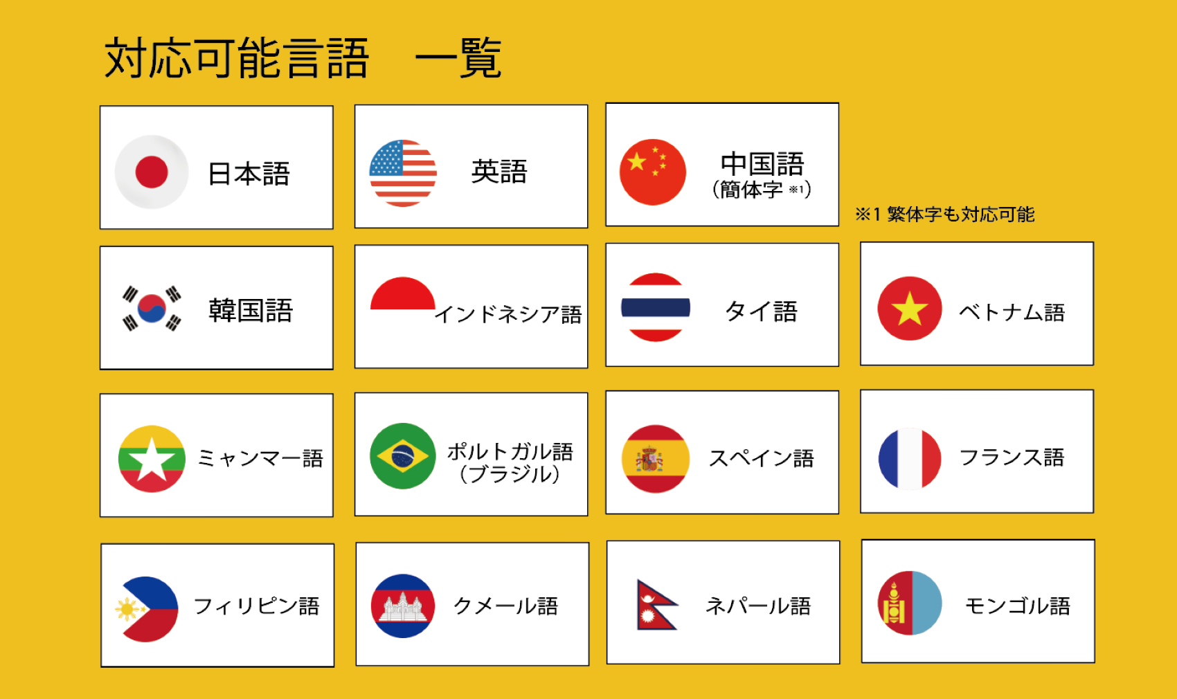 1対1(日本語⇔英語等)での対応はもちろん、日本語から複数言語への一括翻訳も可能です。英語・中国語・フランス語・スペイン語などの主要言語のほか、東南アジア圏(インドネシア・タイ・ベトナム 等)の言語にも対応しており、シチュエーションに合わせてご利用可能です。また、用途に応じてラインナップからお選びいただくことで色々なシーンでご利用いただけます。