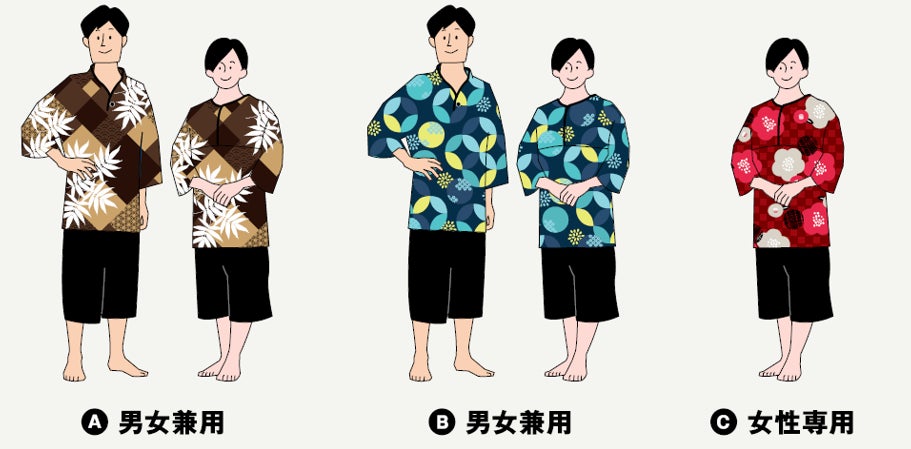 館内着は3種類ご用意。体形を選ばずシルエットが気にならないデザインに仕上げた男女兼用が2種、華やかでお洒落なデザインに仕上げた女性専用が1種です。デザインだけでなく、手触りが良く通気性抜群の素材感もポイントです。かわいいだけじゃなく着心地がとても良いです。