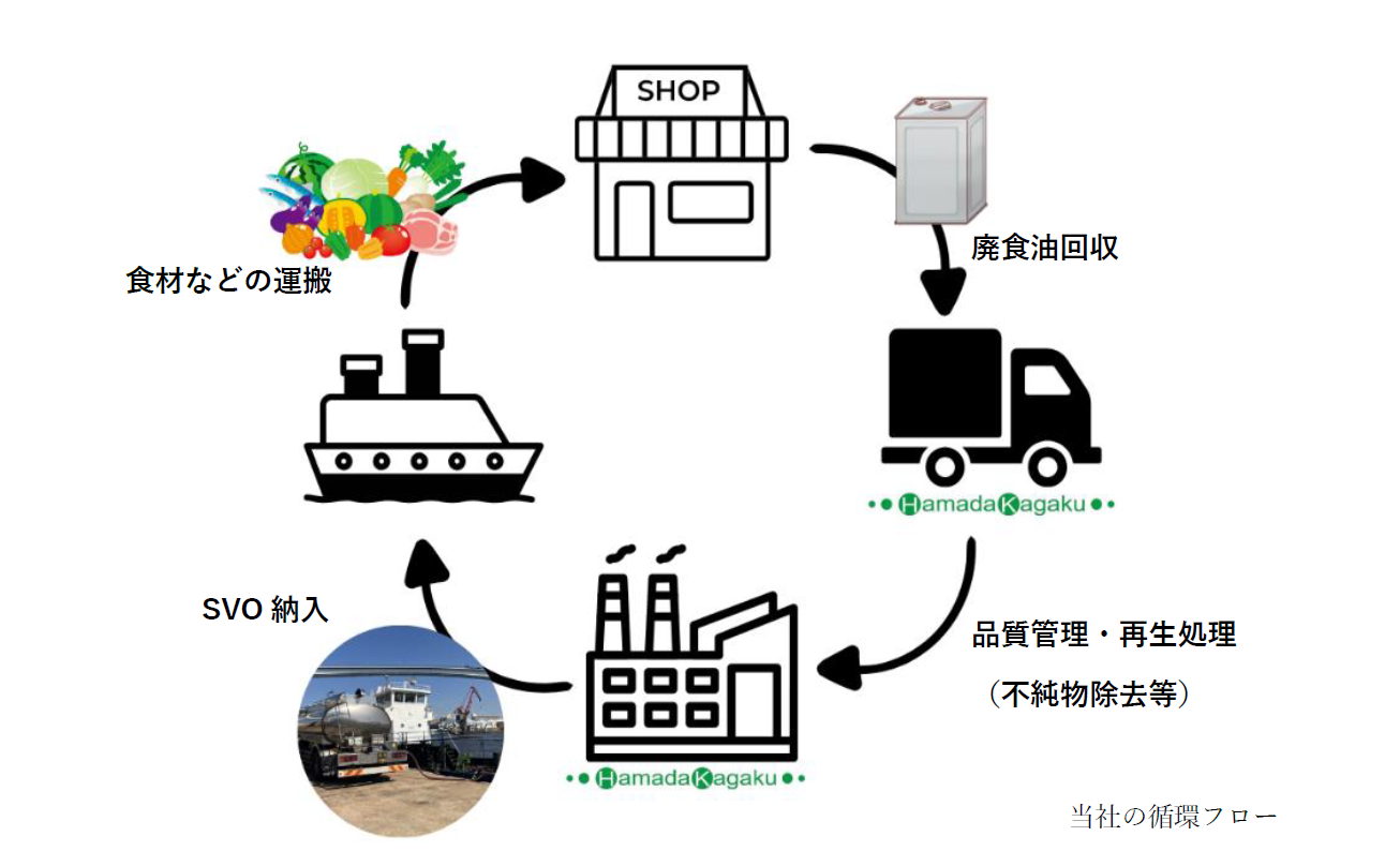 この技術を活かし、飲食店やコンビニから排出される廃食油を使用した燃料で船舶を運航し、再び食材や商品を飲食店やコンビニに届けることによる、資源循環を実現します。