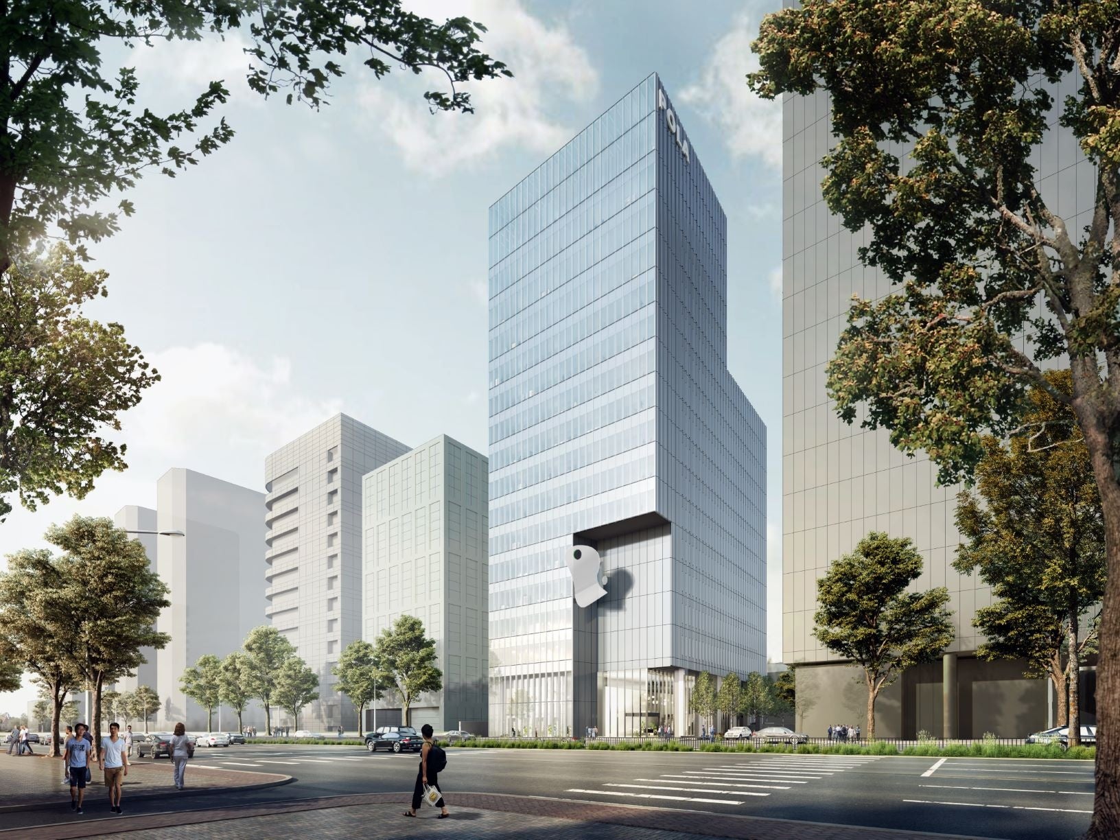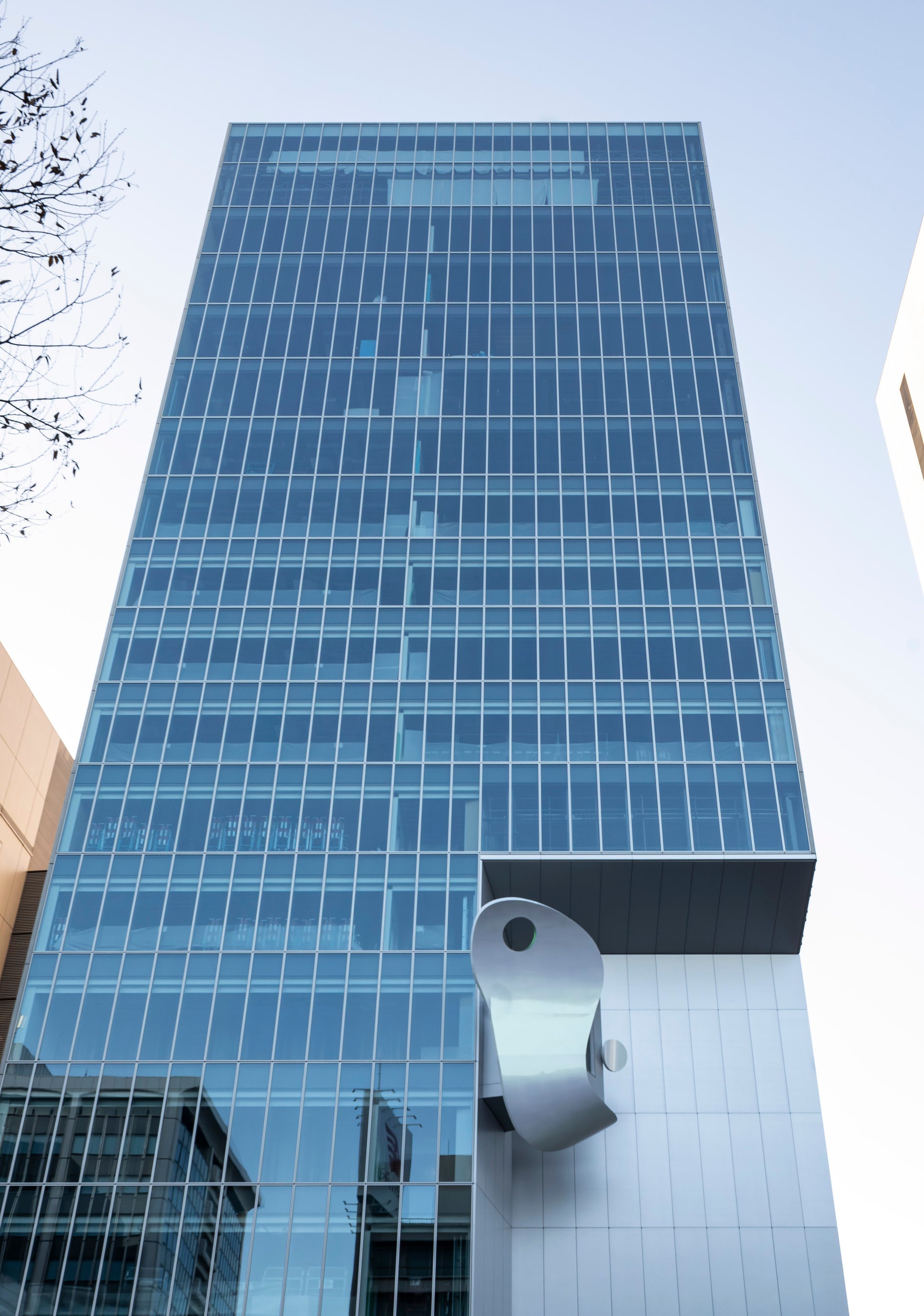青山通りに面し、神宮外苑の緑を望む立地。保育園やイベントホールも併設し、新たな交流の場をめざします。