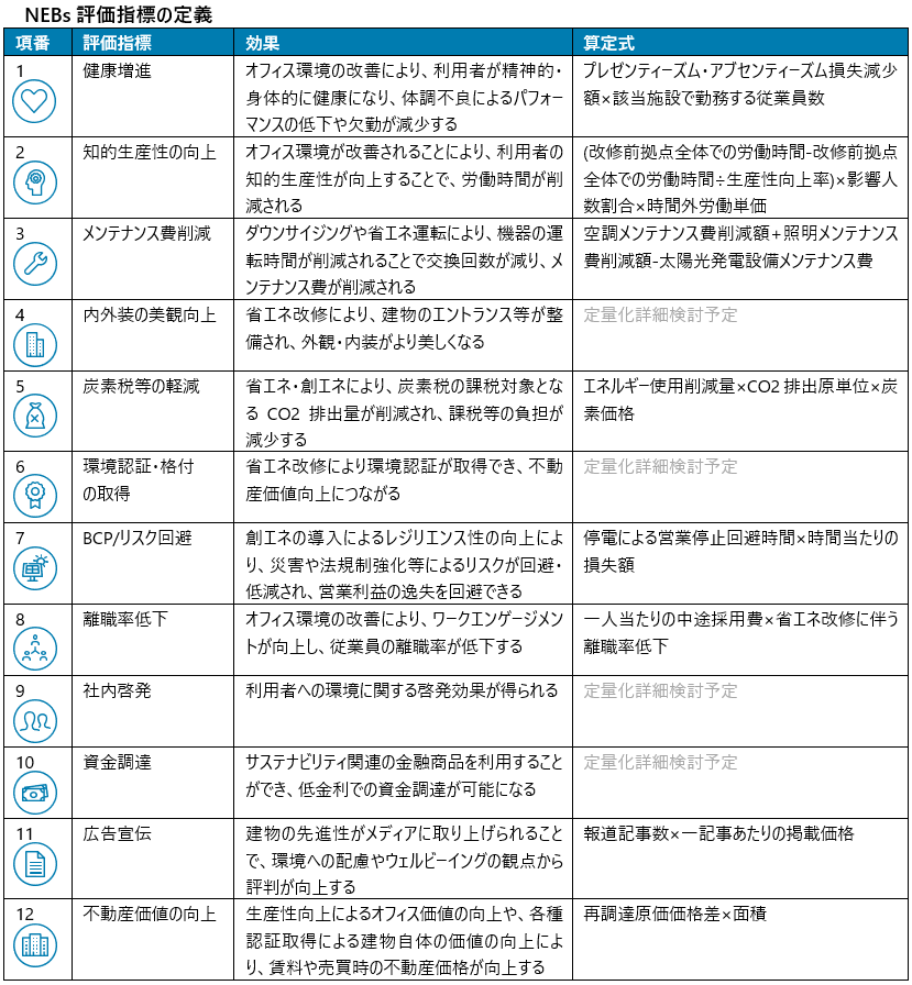 今回のNEBs評価指標の開発は、主にオフィスビルの新築・改修の効果測定を念頭に行いました。評価指標の策定に当たっては、オフィスビルのユーザーである従業員や、企業や消費者等の顧客、政府・自治体や地域社会、金融機関や株主・投資家、NPOやNGOといったステークホルダーに省エネ建築物がもたらす効果について網羅的に洗い出しを行いました。加えて、国内外の既存調査に照らして妥当性の検証を行い、省エネビルの新築・改修に伴う効果項目として12の指標を定義しました。