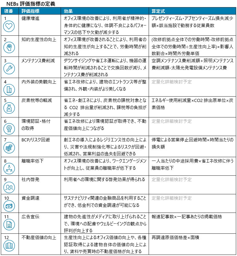 こうした背景から、ZEBプランナーとして長年ZEBの設計・監理を手掛けてきたNTTファシリティーズと、カーボンニュートラルの包括支援の経験やオフィスビルで働く従業員のウェルビーイングに関する知見が豊富なデロイト トーマツは、その知見を活かして2023年4月より省エネ建築物のエネルギー・光熱費削減以外の効果の定量評価手法の開発に取り組んでいます。エネルギー・光熱費削減以外の効果は、Non-Energy Benefits(NEBs [ネブズ])と呼称される効果であり、本取り組みでは後述の「健康増進」「知的生産性向上」等のNEBs の評価指標を示しました。