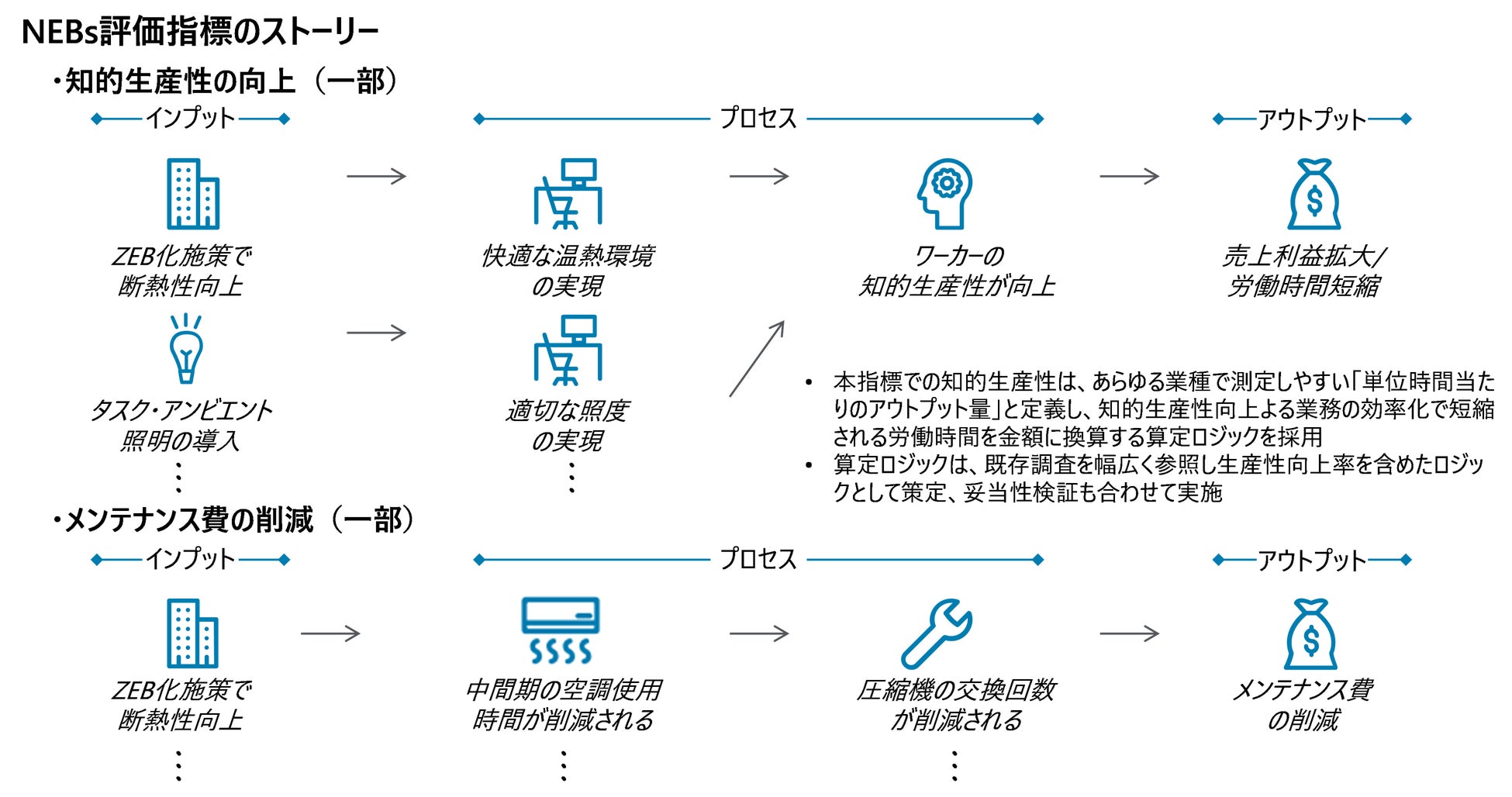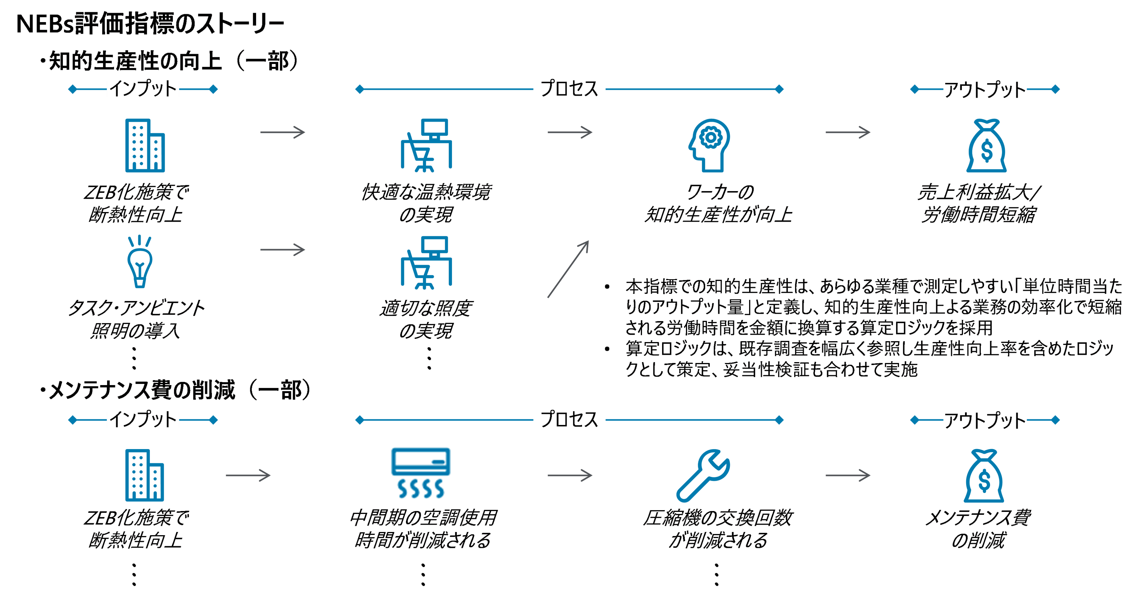 評価指標は、社内データ(施設設備に関する情報、従業員に関する情報等)及び社員へのアンケートから得られた情報、施設設備の利用状況の確認や従業員へのヒアリング実施により、NEBsの数値を実態に合うように精緻化を行うことも可能です。