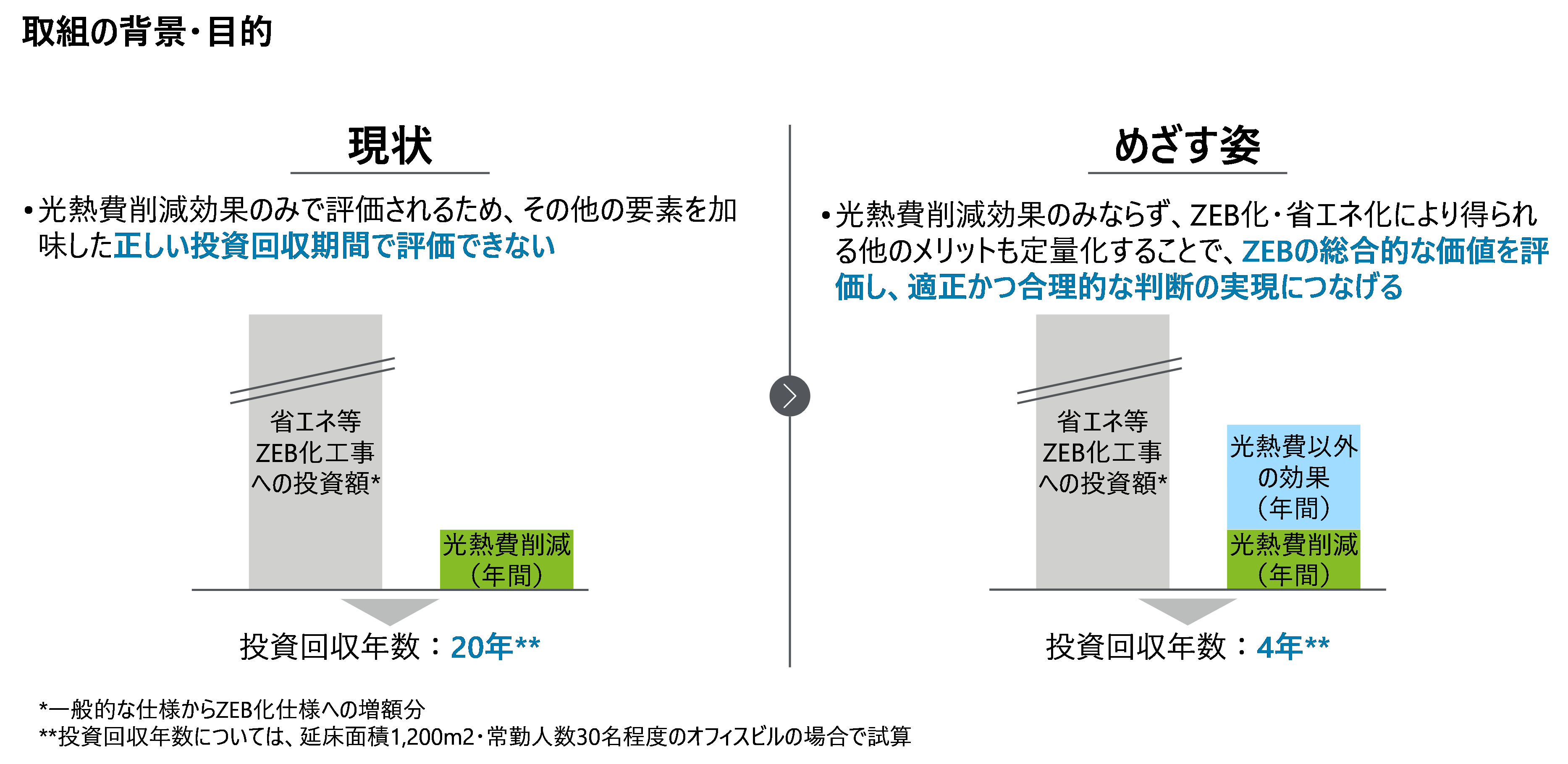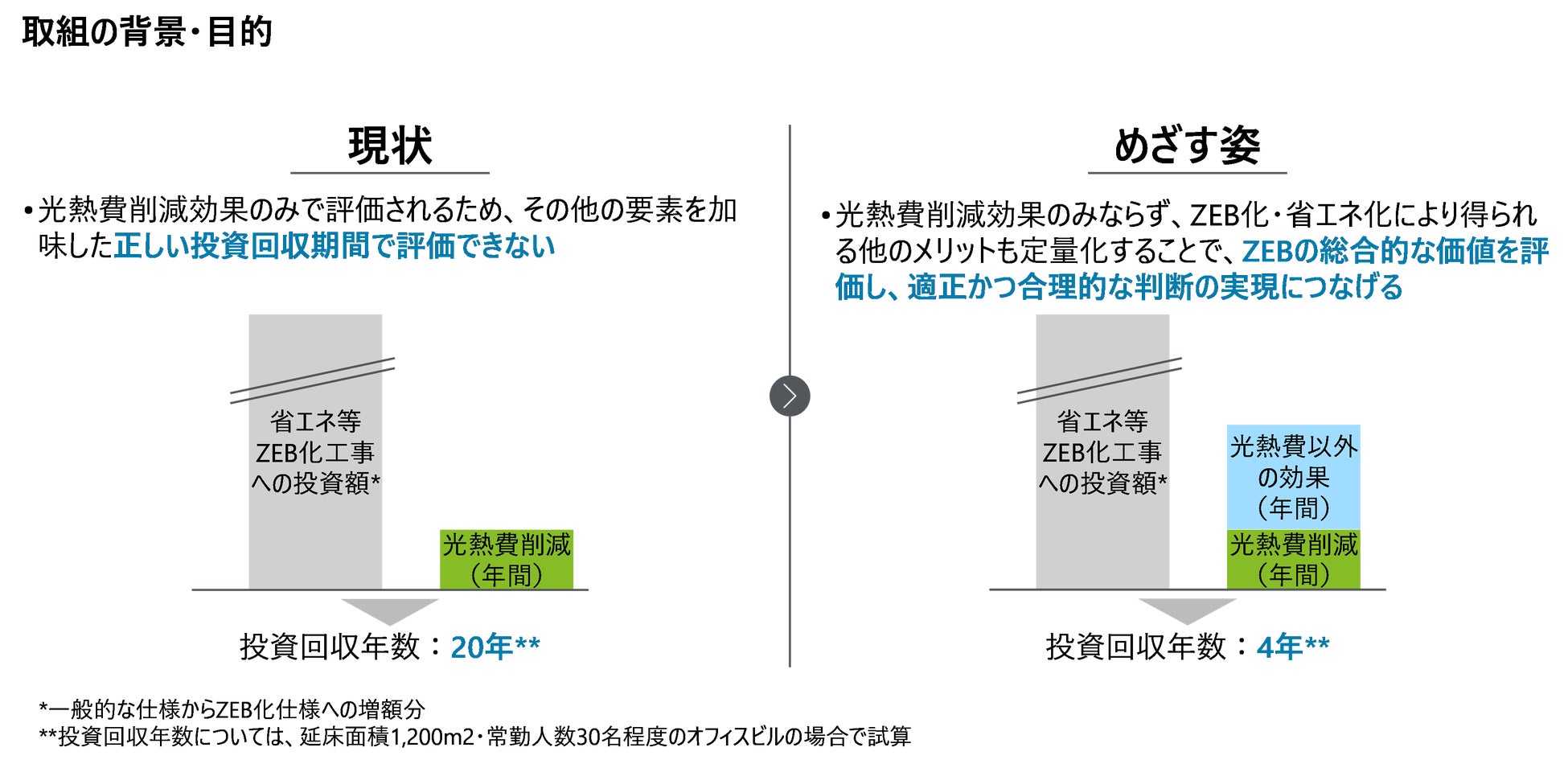 本評価指標を用いることにより、省エネ建築物の新築・改修における効果を総合的に金額換算にて評価することが可能となり、投資対効果を適切に評価できるようになります。延床面積1,200㎡・常勤人数30名程度のオフィスビルの場合、投資回収年数は20年から4年になることが試算されました。