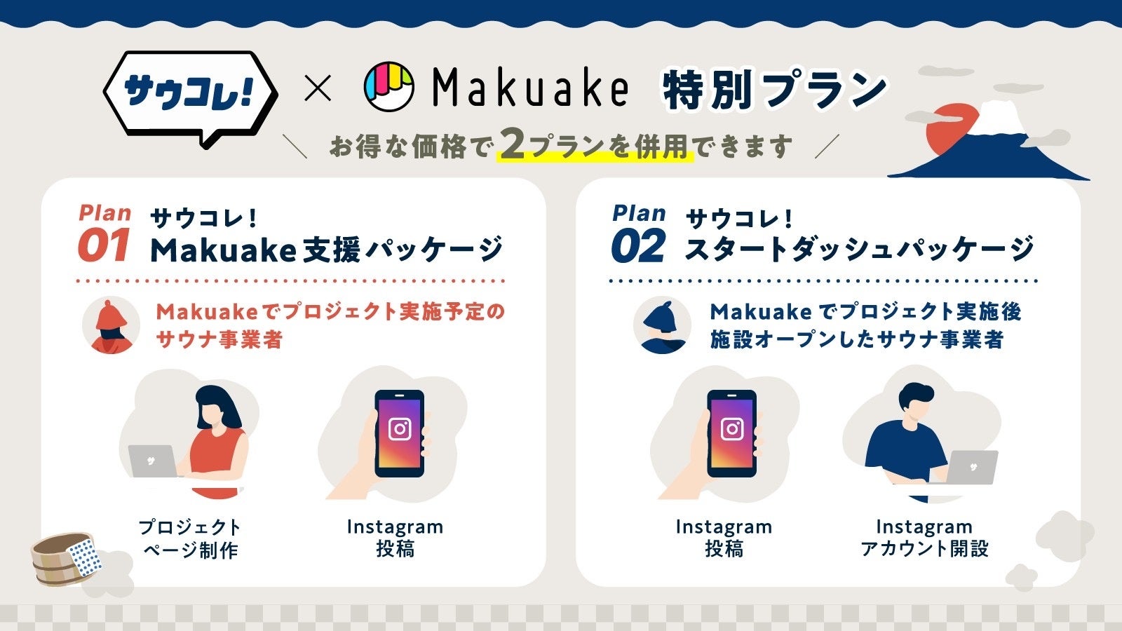 「サウコレ!Makuake支援パッケージ」は、これから「Makuake」でプロジェクトを実施する予定のサウナ関連事業者のプロジェクト準備を支援します。プロジェクトページの制作や「サウナコレクション」でのプロジェクトに関するSNS投稿などを含むプランとなります。