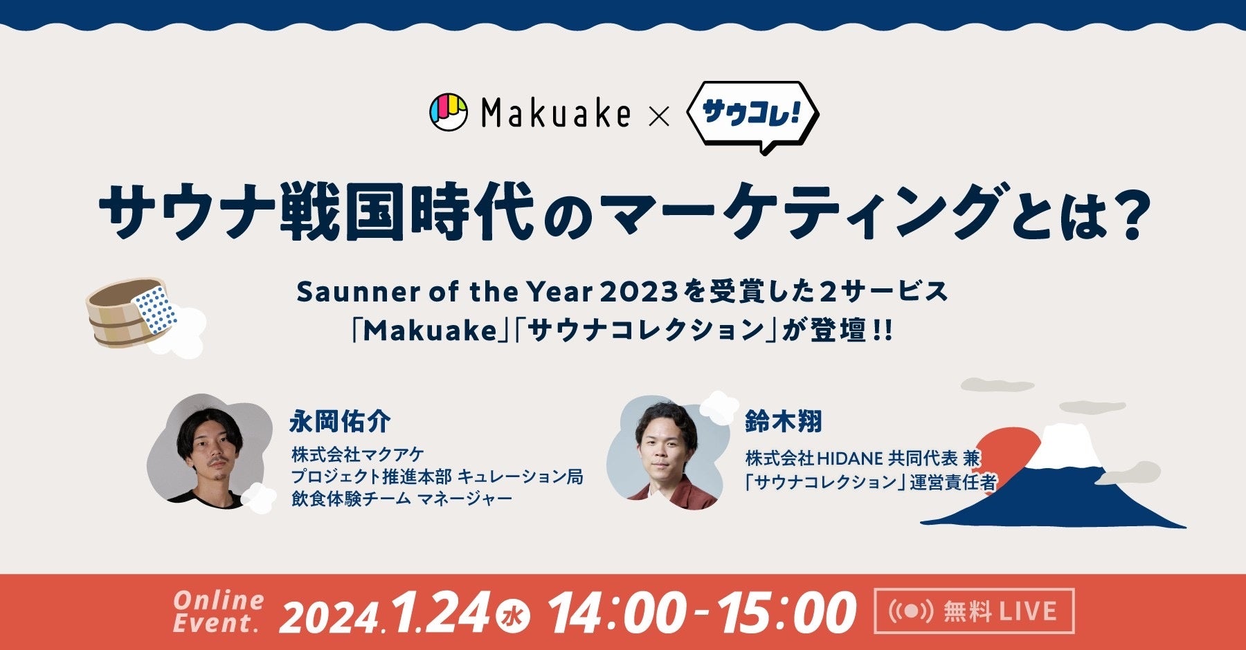 今回の業務提携・「Makuake」特別プラン提供開始を記念して、サウナ関連事業者のための共催セミナー「サウナ戦国時代のマーケティングとは?~Saunner of the Year 2023を受賞した2サービス「Makuake」「サウナコレクション」が登壇〜」を2024年1月24日(水)14:00-15:00に開催します。