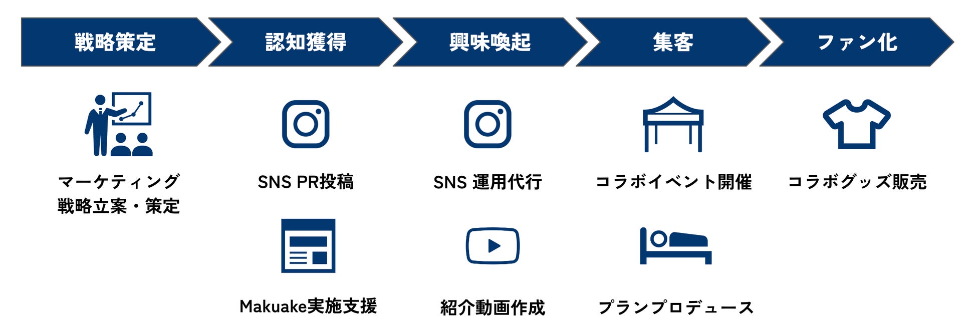 当社のサウナ関連事業者向けの「マーケティング支援事業」は、マーケティングの戦略立案・策定から、強みである「サウナコレクション」を用いたPR投稿はもちろん、SNS運用代行やYouTube動画制作、さらにはコラボイベント開催やサウナプランのプロデュース、コラボグッズの販売、そしてアタラシイものや体験の応援購入サービス「Makuake」の実施支援まで、幅広い施策の実施が可能です。