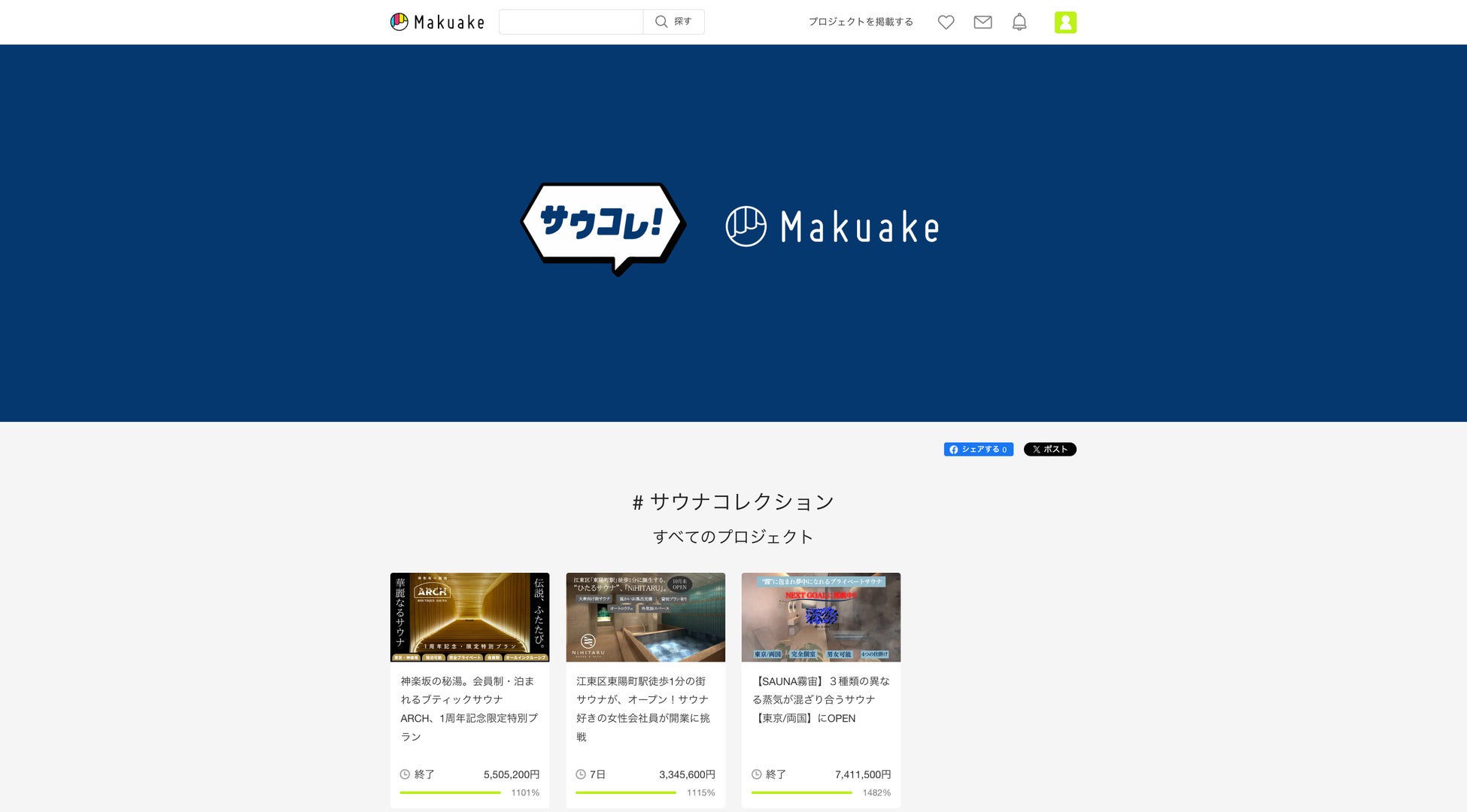また、業務提携開始に合わせて「Makuake」内に「サウナコレクション」特設ページをオープンしました。 「#サウナコレクション」のタグがついたプロジェクトが掲載される特設ページで、サウナを好きな方々が、サウナ関連事業者のプロジェクトを見つけやすくなります。