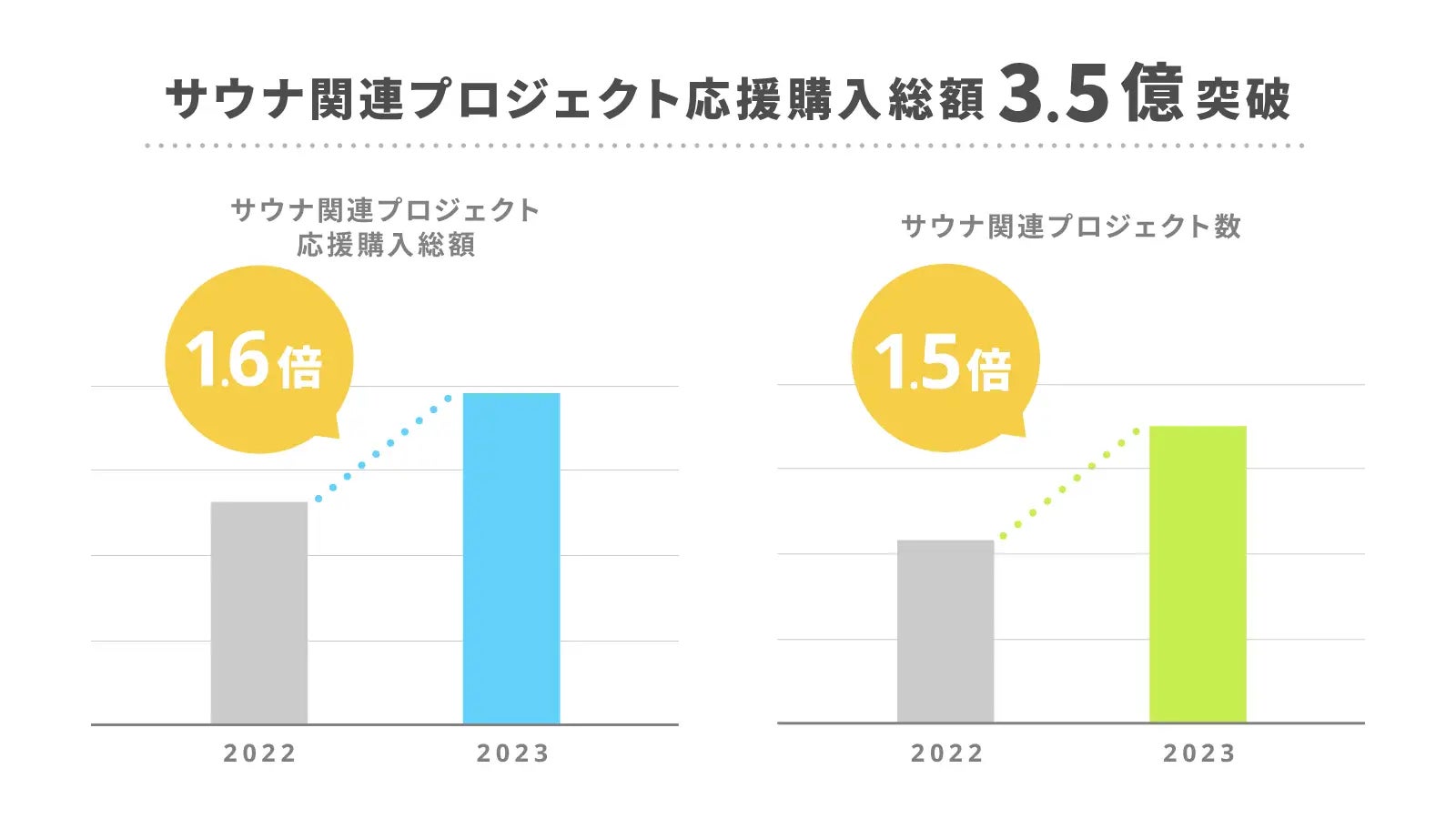 2023年には「Makuake」のサウナ関連プロジェクトの累計応援購入総額が3.5億円を突破、前年比1.6倍となり「Makuake」の中でも人気のジャンルとなっています。