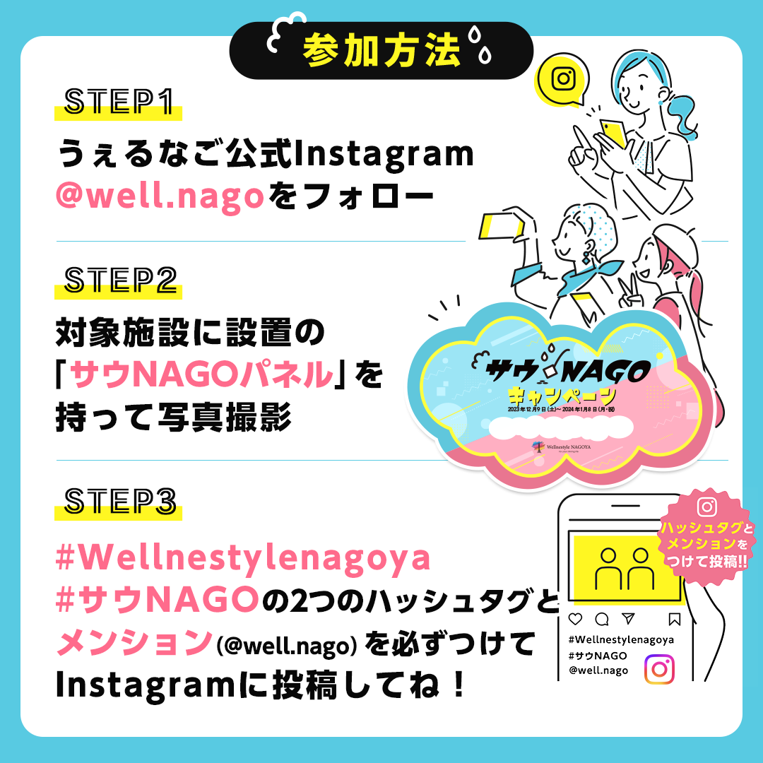 3.「#Wellnestylenagoya」「#サウNAGO」の2つのハッシュタグとメンション(@well.nago)をつけてInstagramに投稿してください。