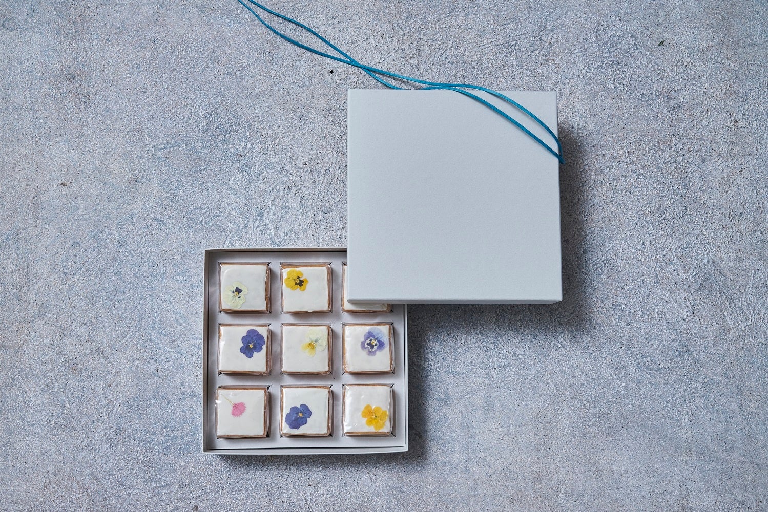 マカロン氏が生み出すスイーツは、味・ビジュアルともに洗練された逸品です。その中で、エディブルフラワーをあしらったキューブケーキは、白いキャンバスに花を描いた芸術作品のようで、ひと際目を引きます。特別なおもてなし、大切な方へのギフトとして最適で、丸の内においても唯一無二の存在を目指します。