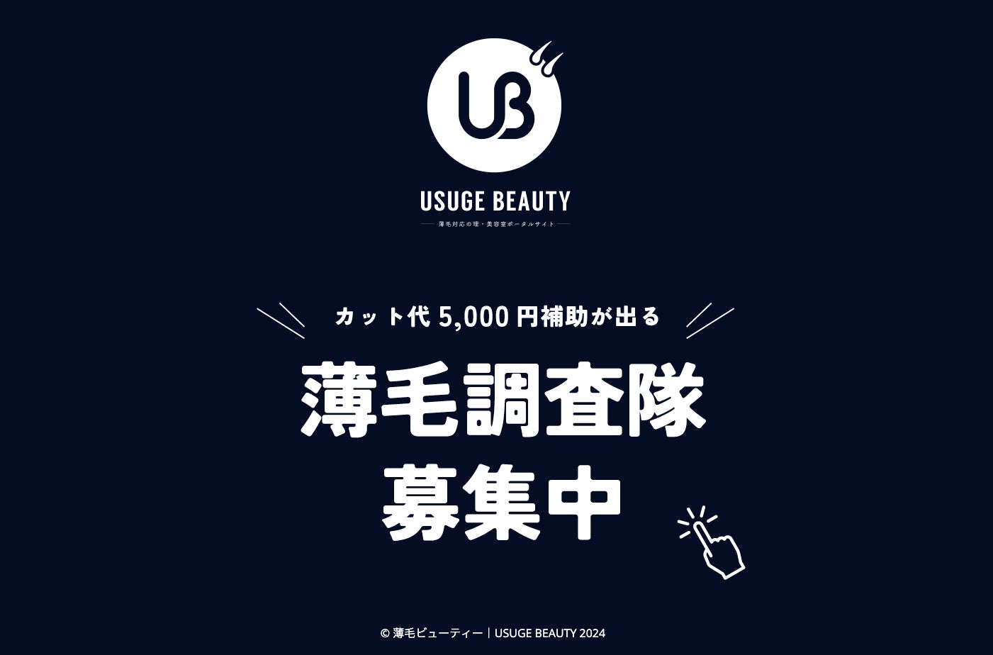 「薄毛ビューティ(https://usuge-beauty.com/entry/)」に掲載する薄毛メニューを取り扱っている理・美容室の調査を行なった方へ謝礼として「ヘアカット費用(上限5,000円)」を贈呈させていただきます。