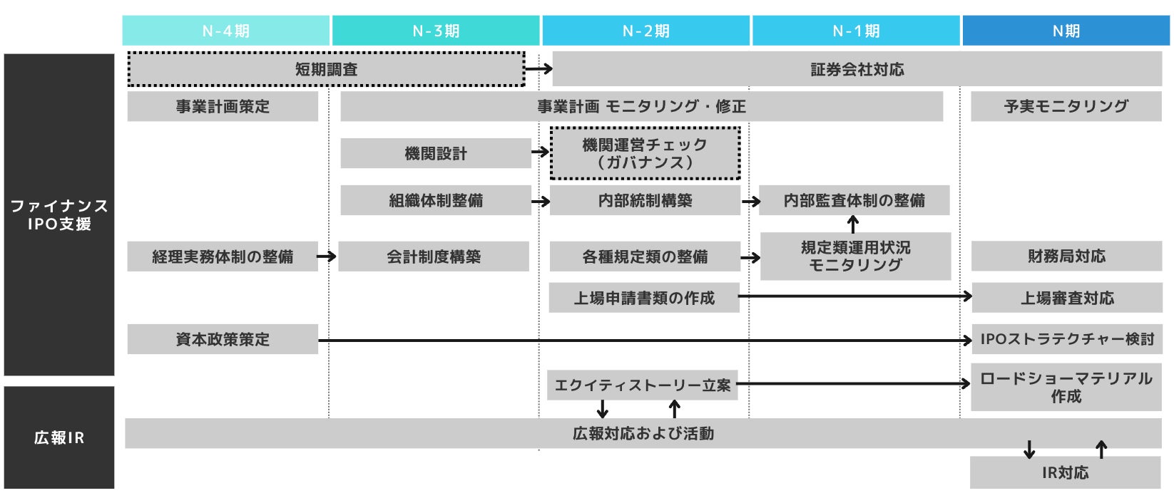 監査法人や主幹事証券会社などの選定サポートから社内の制度・体制のコンサルティング、上場申請までのサポート